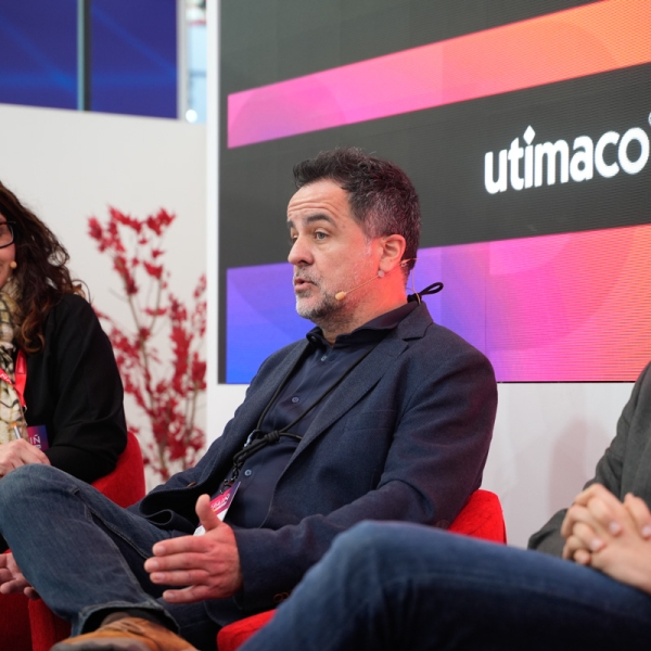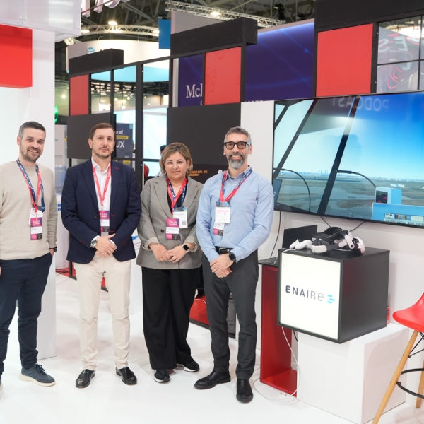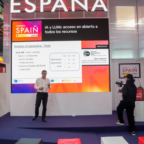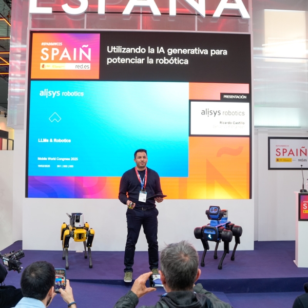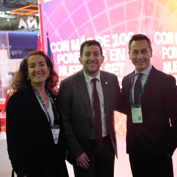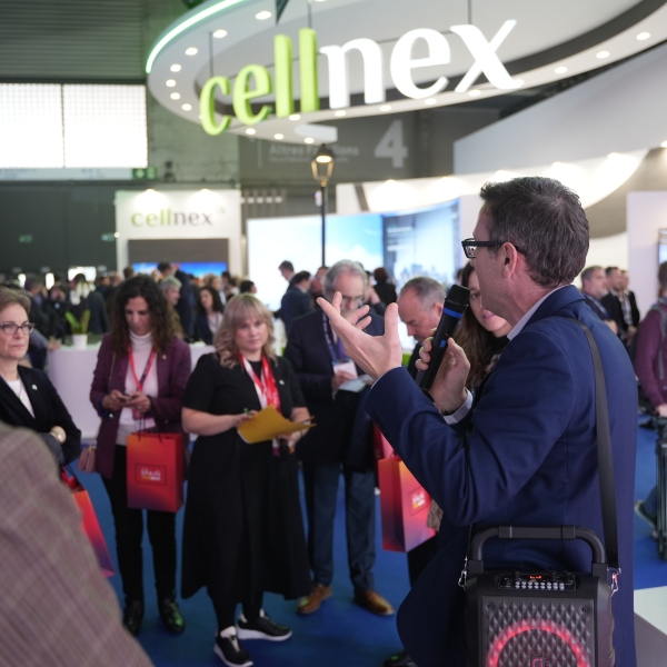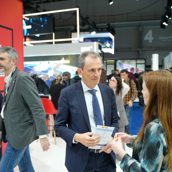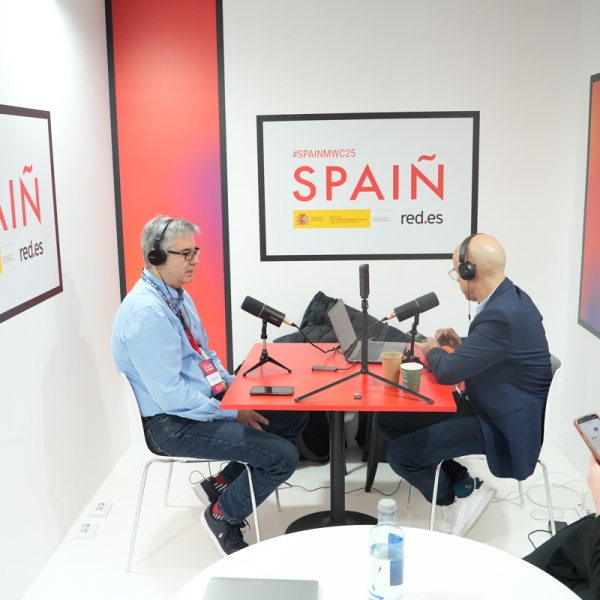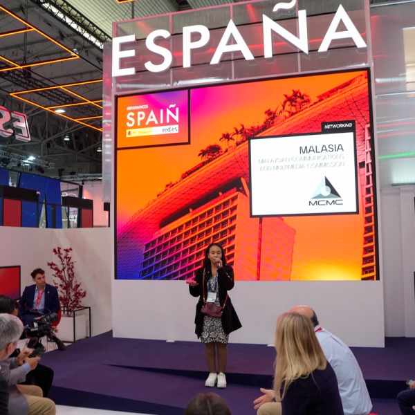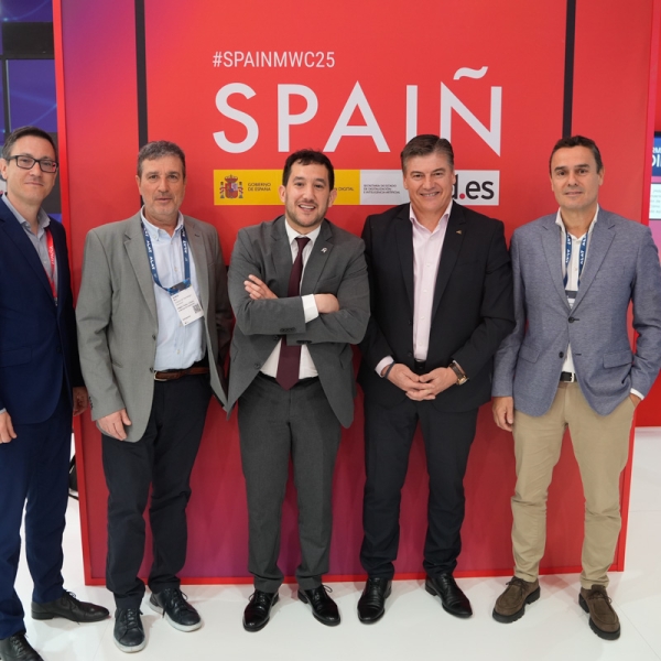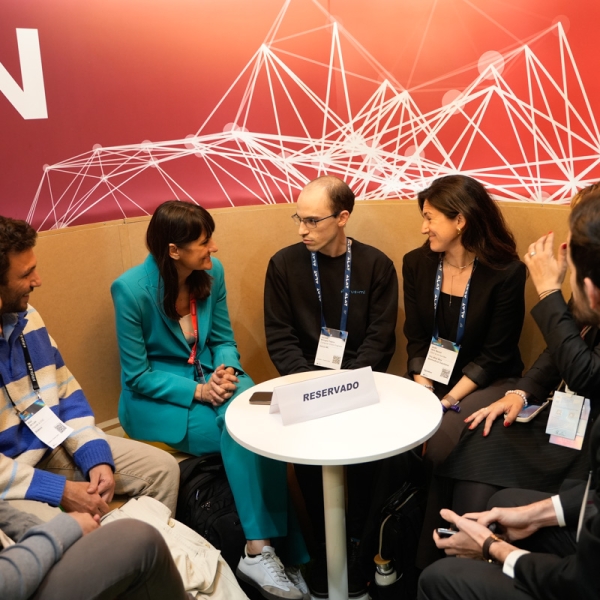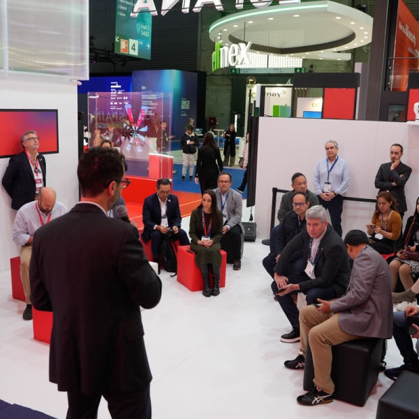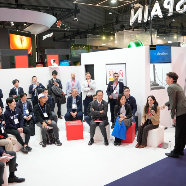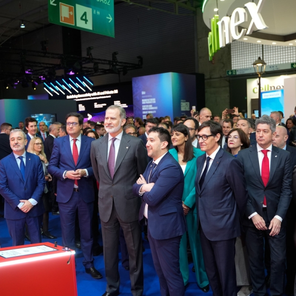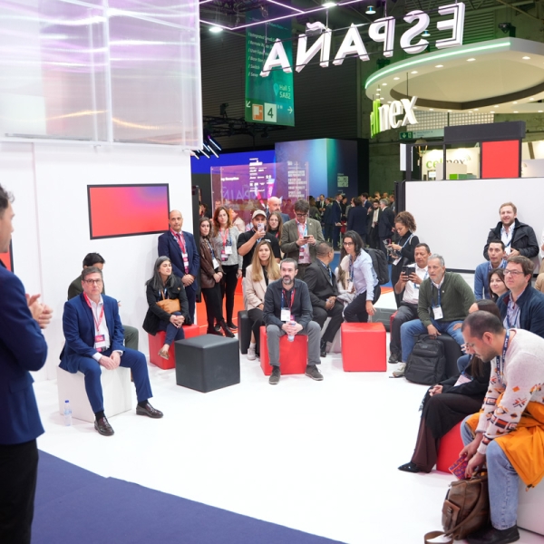 Empresarios/as, ejecutivos/as, expertos/as, autoridades y visitantes reunidos/as en el Pabellón de España durante MWC.