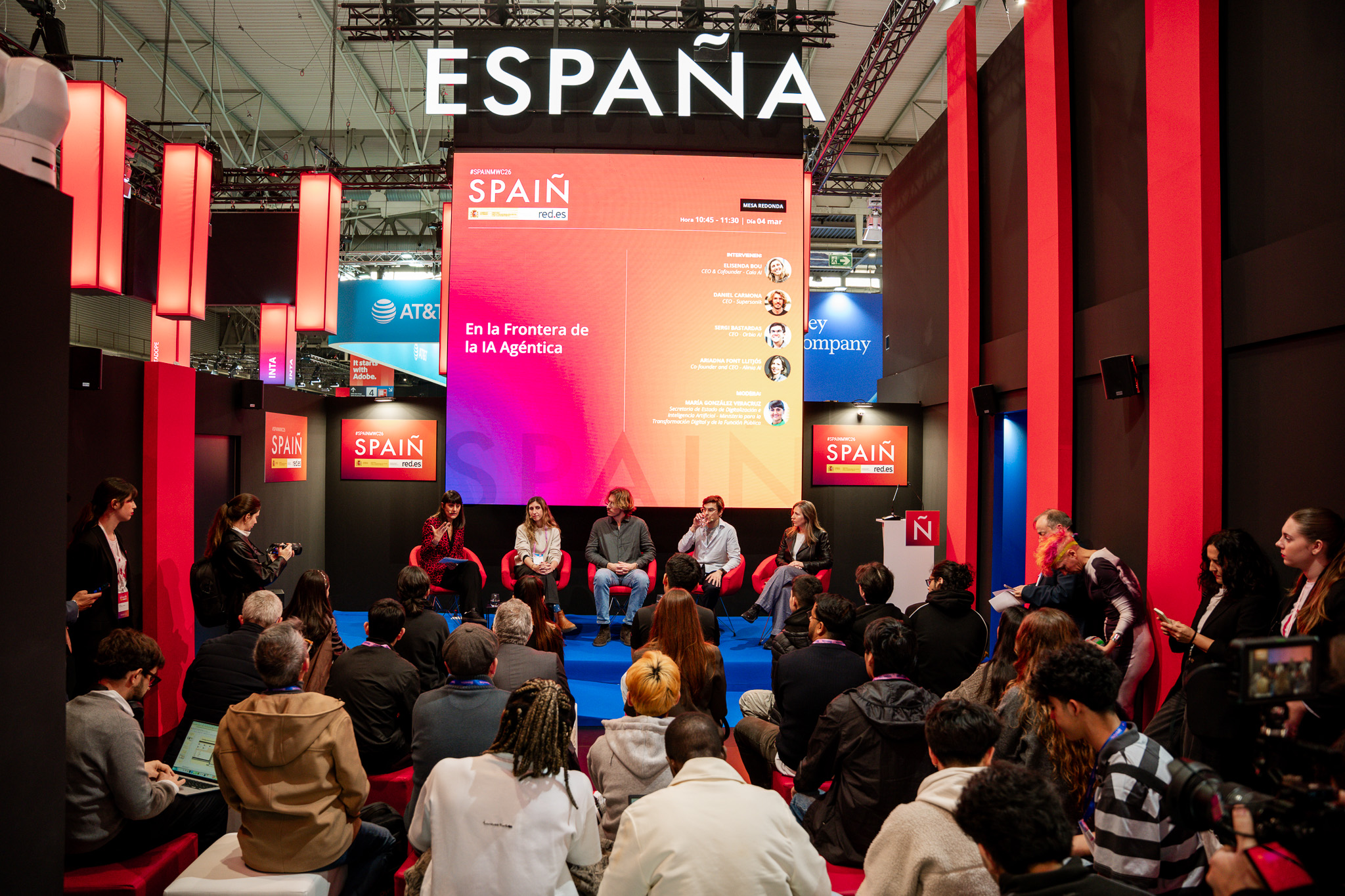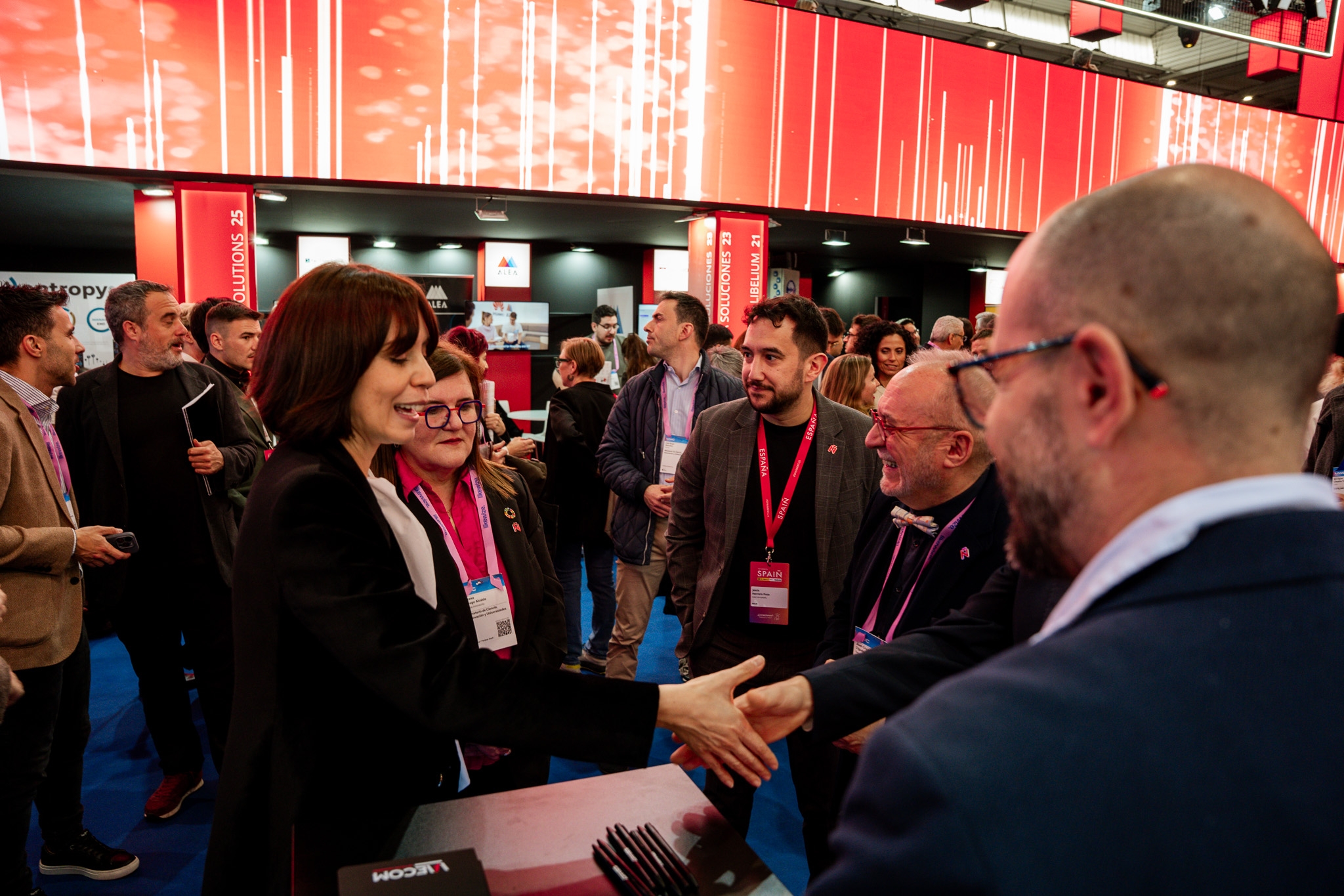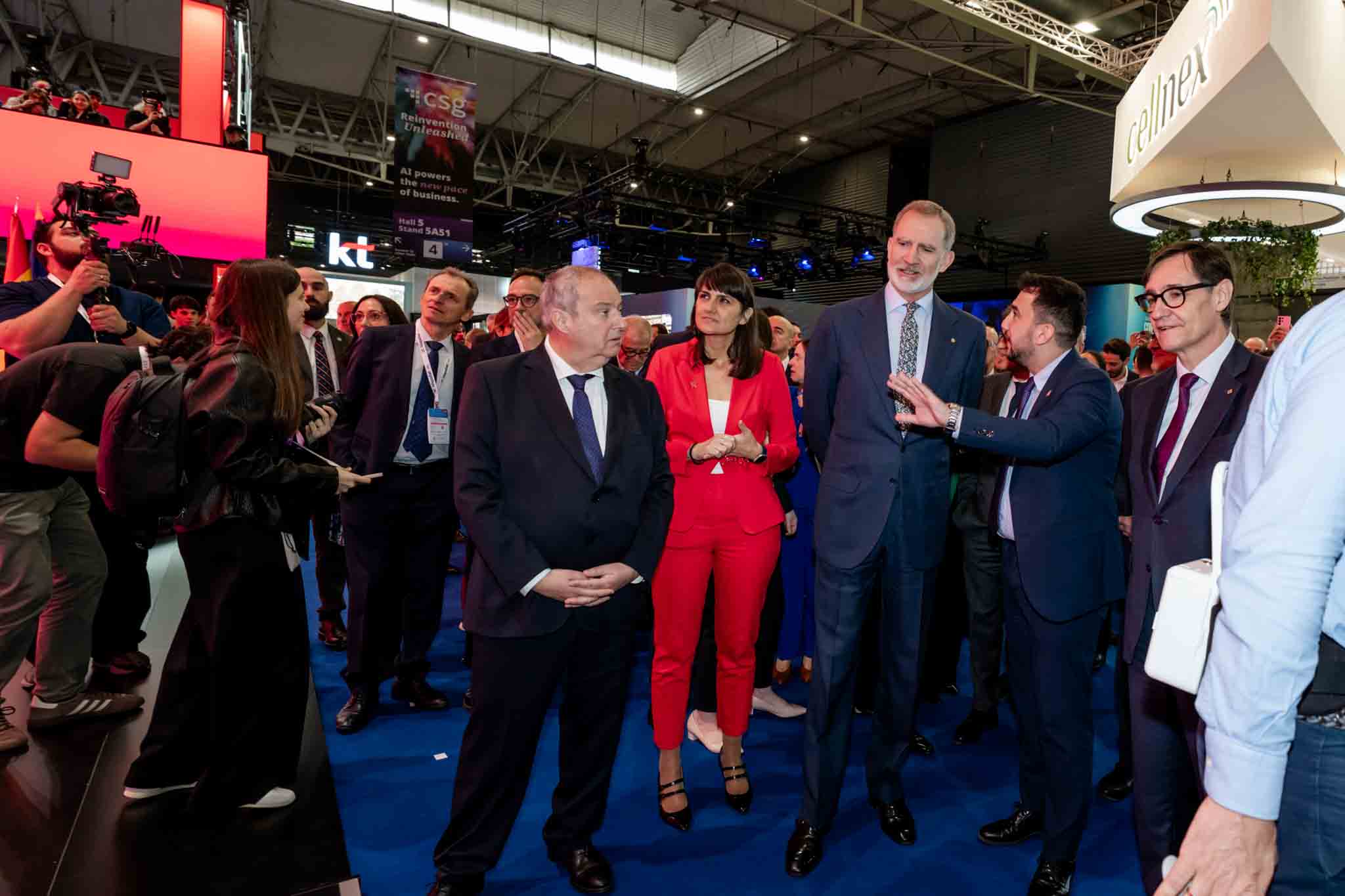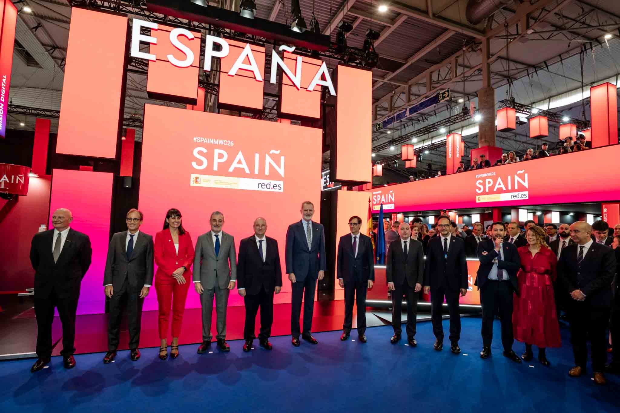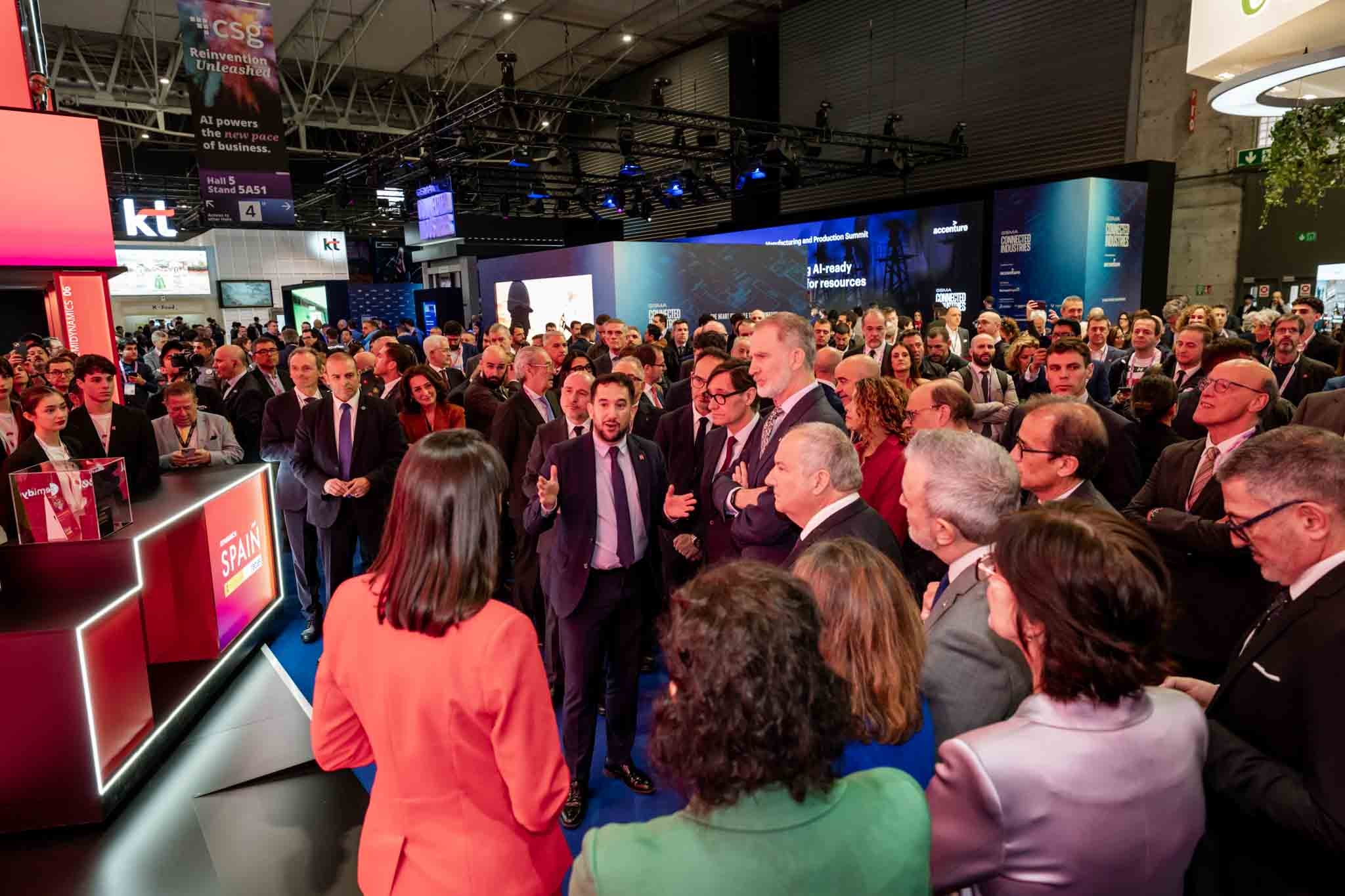 Empresarios/as, ejecutivos/as, expertos/as, autoridades y visitantes reunidos/as en el Pabellón de España durante MWC.
