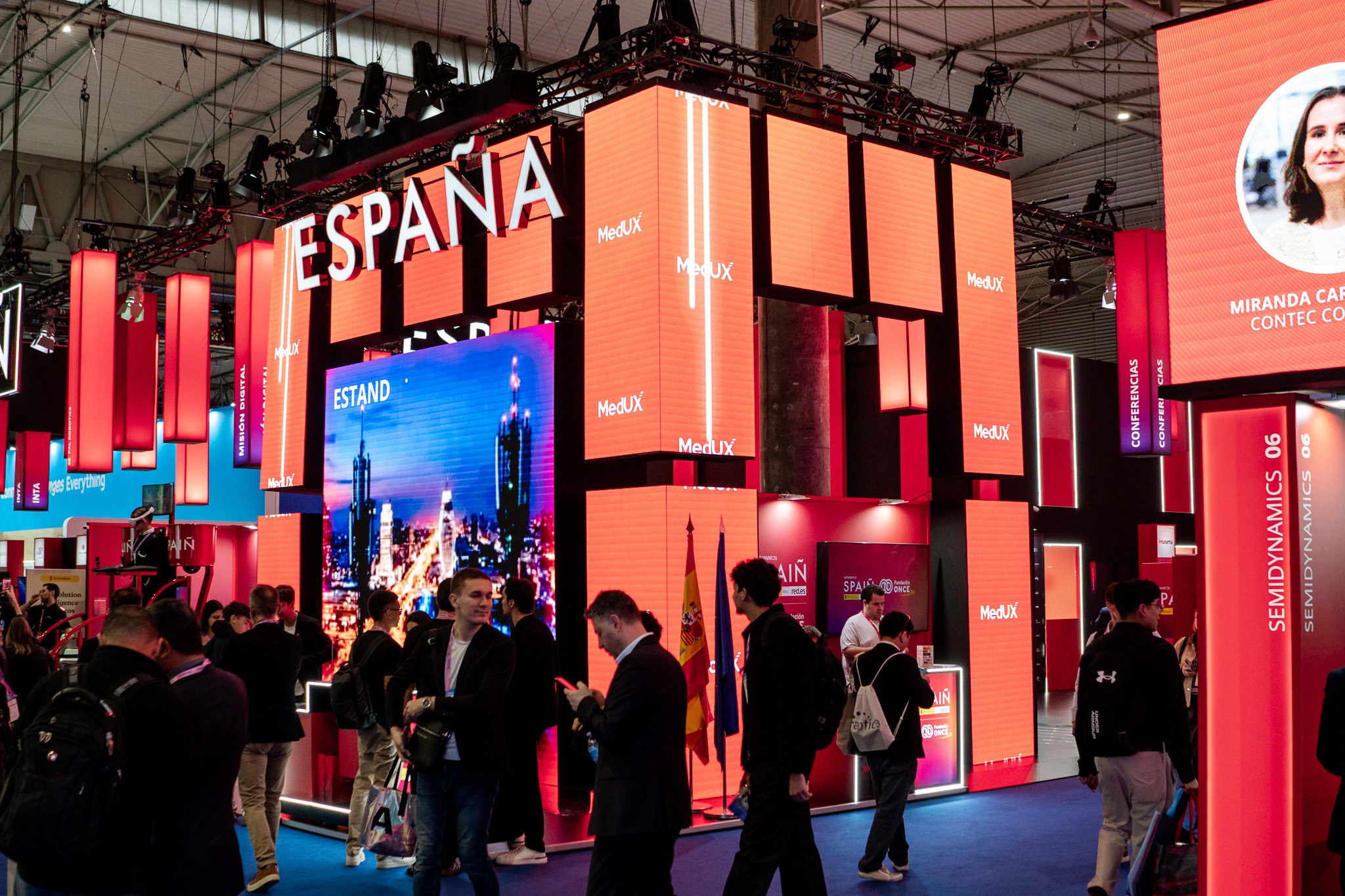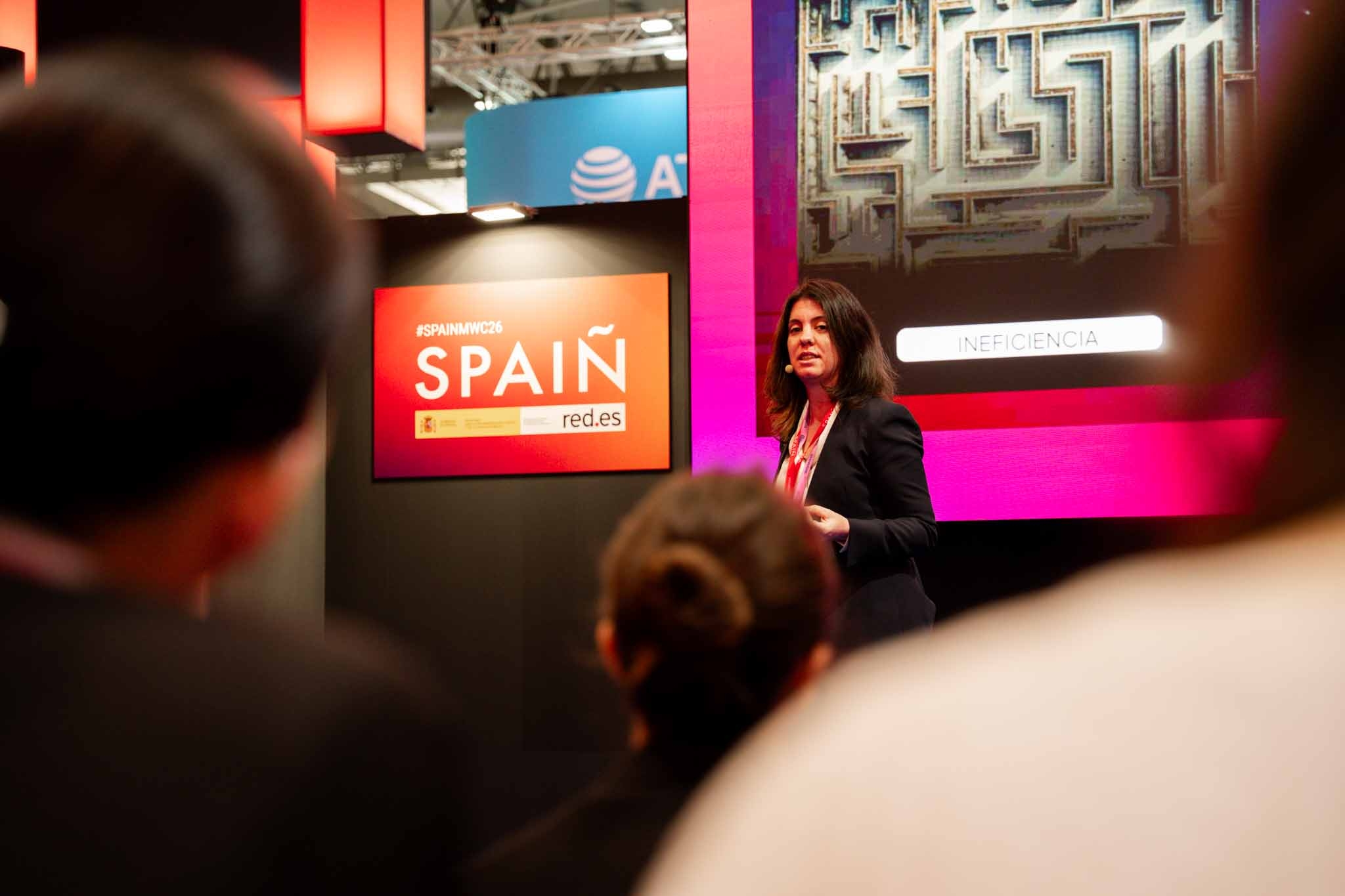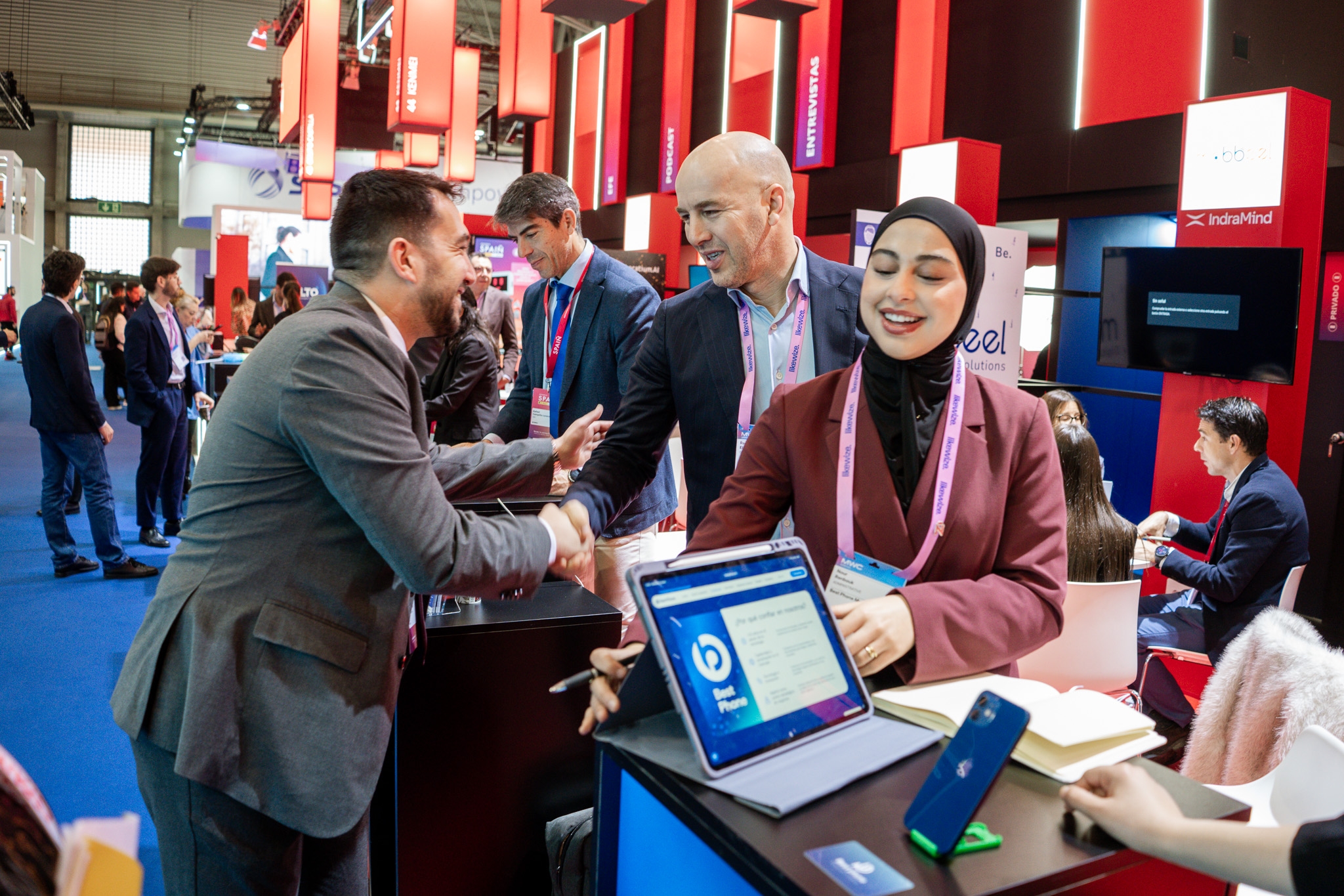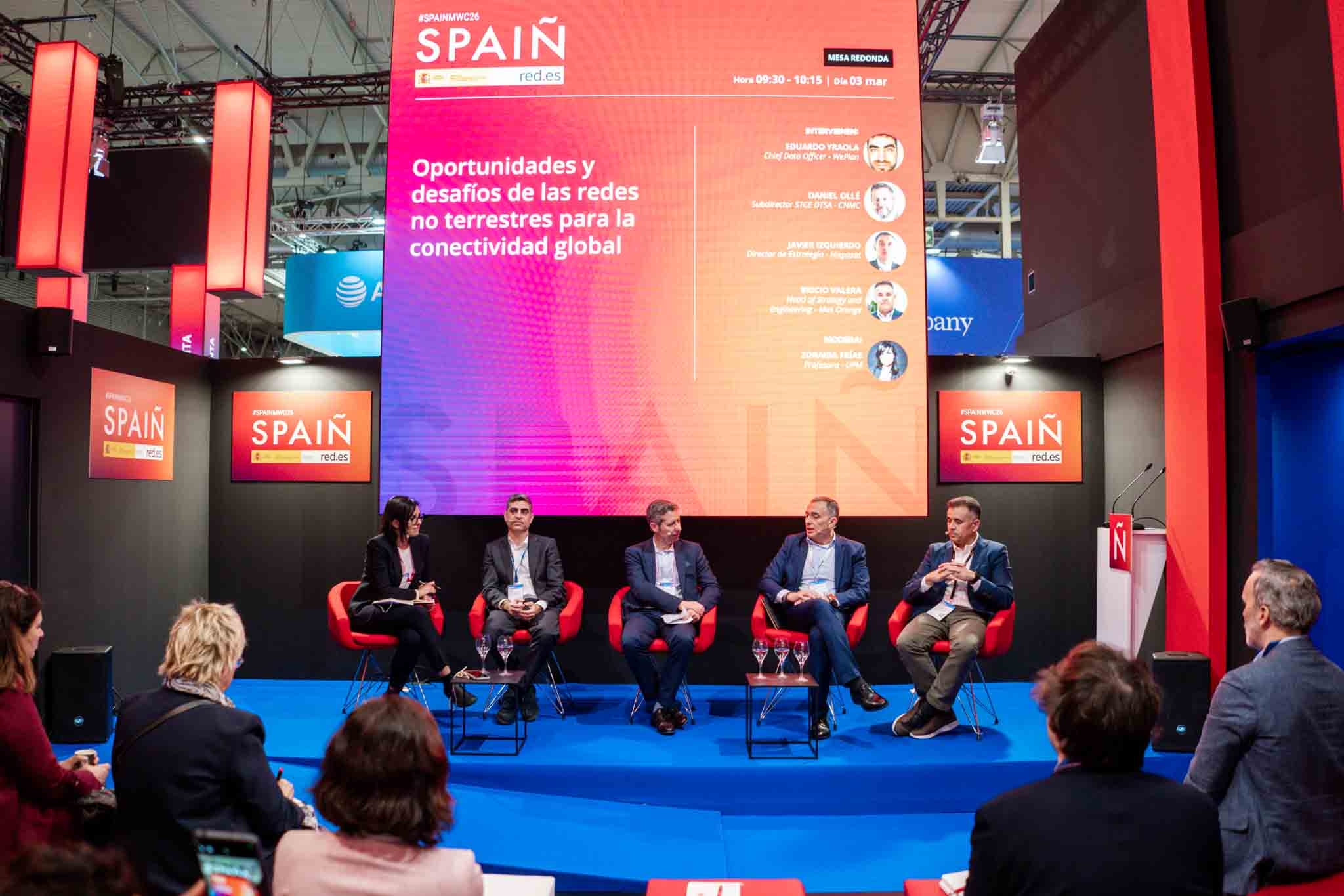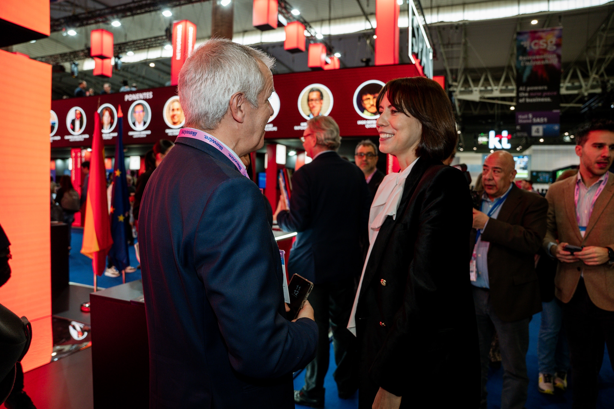 Empresarios/as, ejecutivos/as, expertos/as, autoridades y visitantes reunidos/as en el Pabellón de España durante MWC.