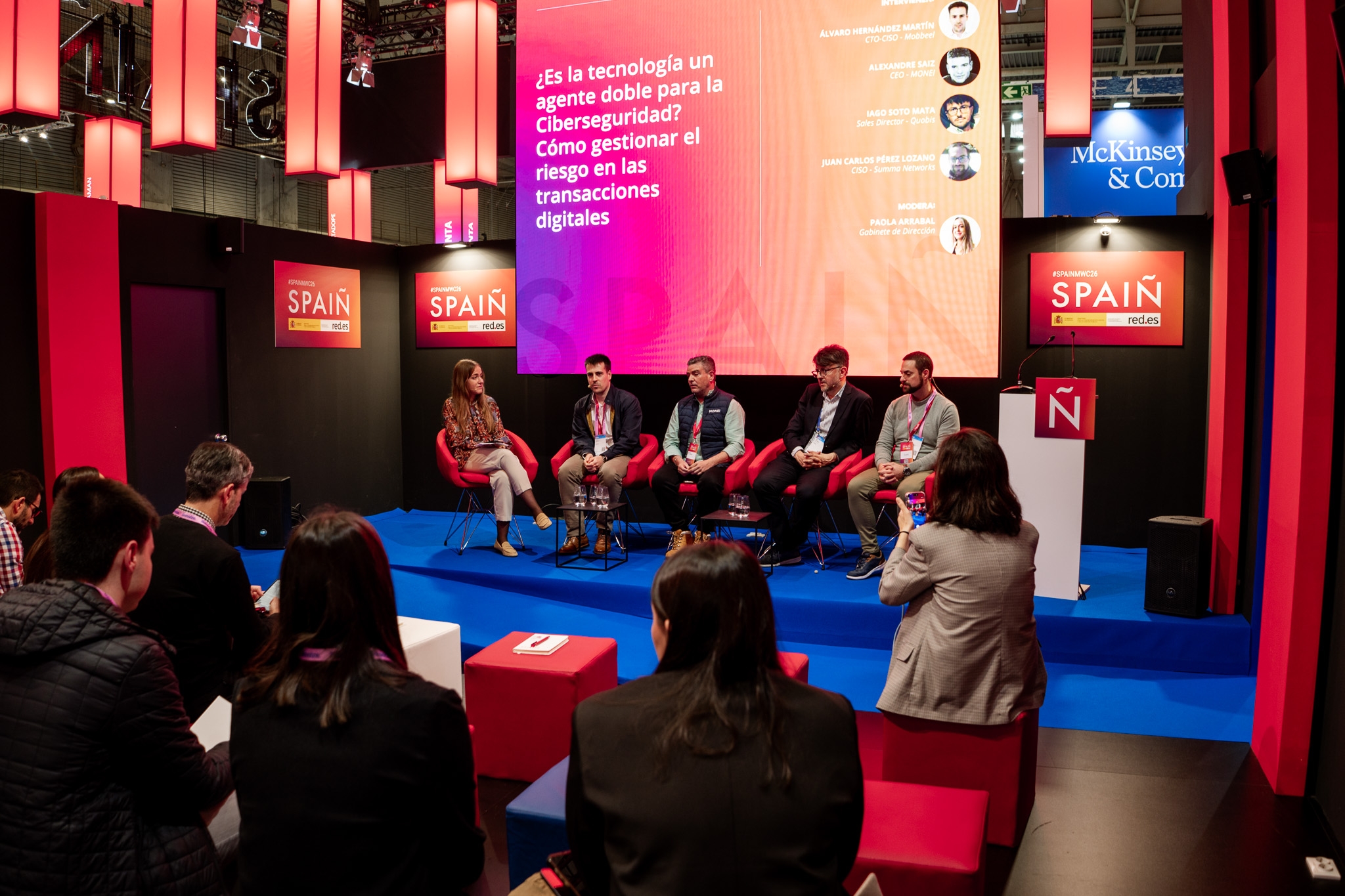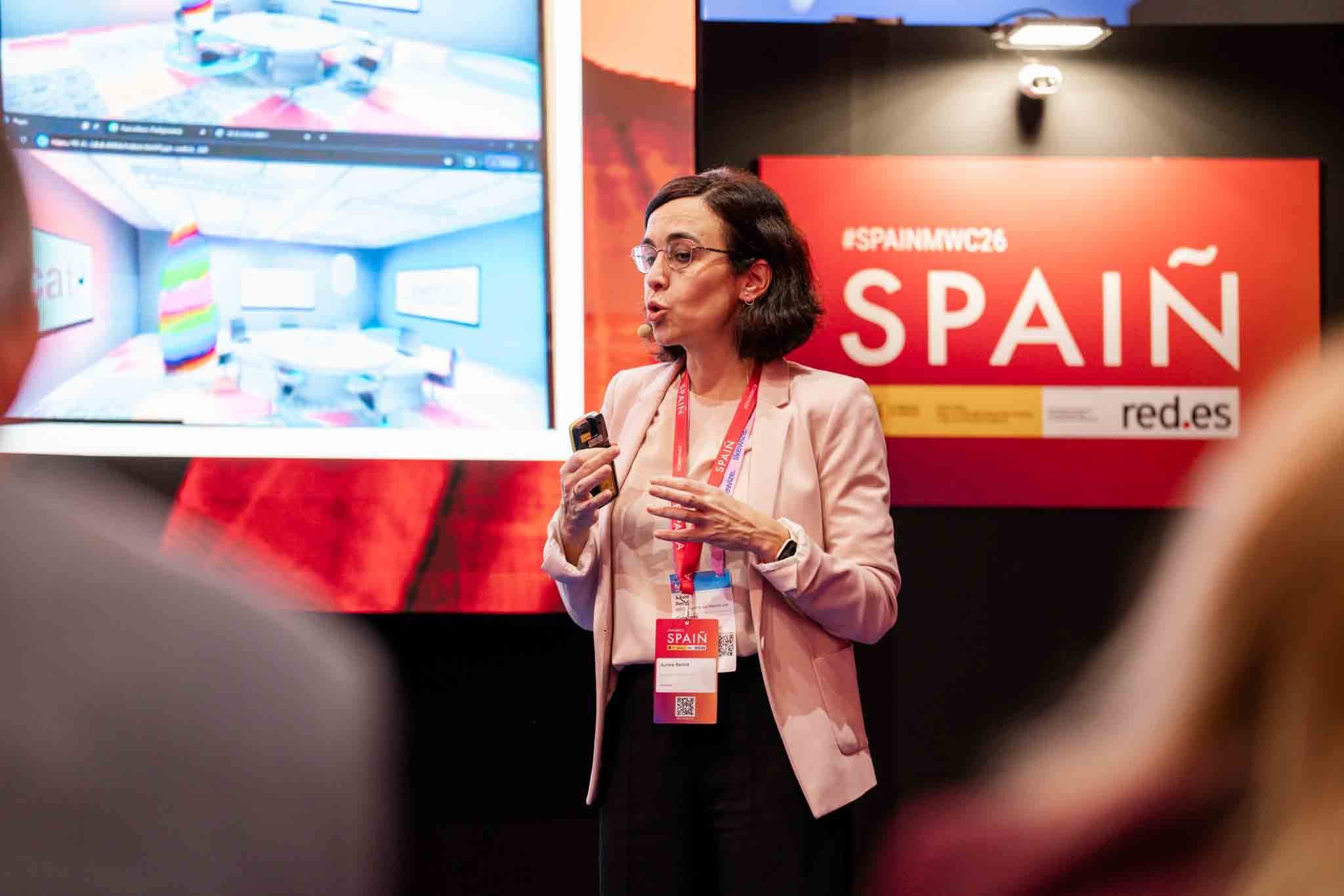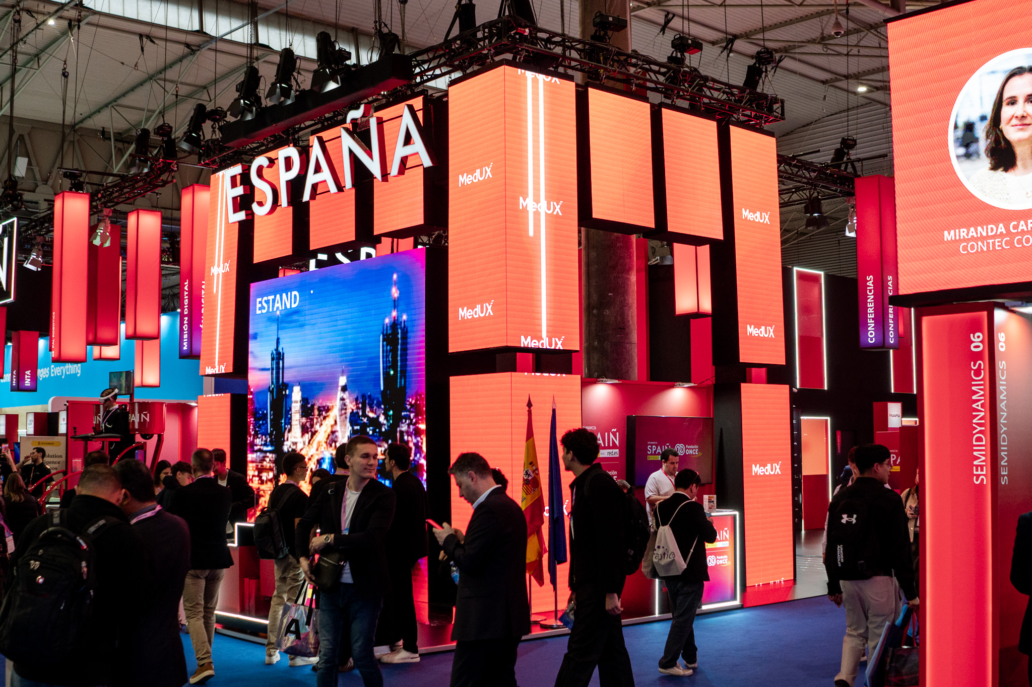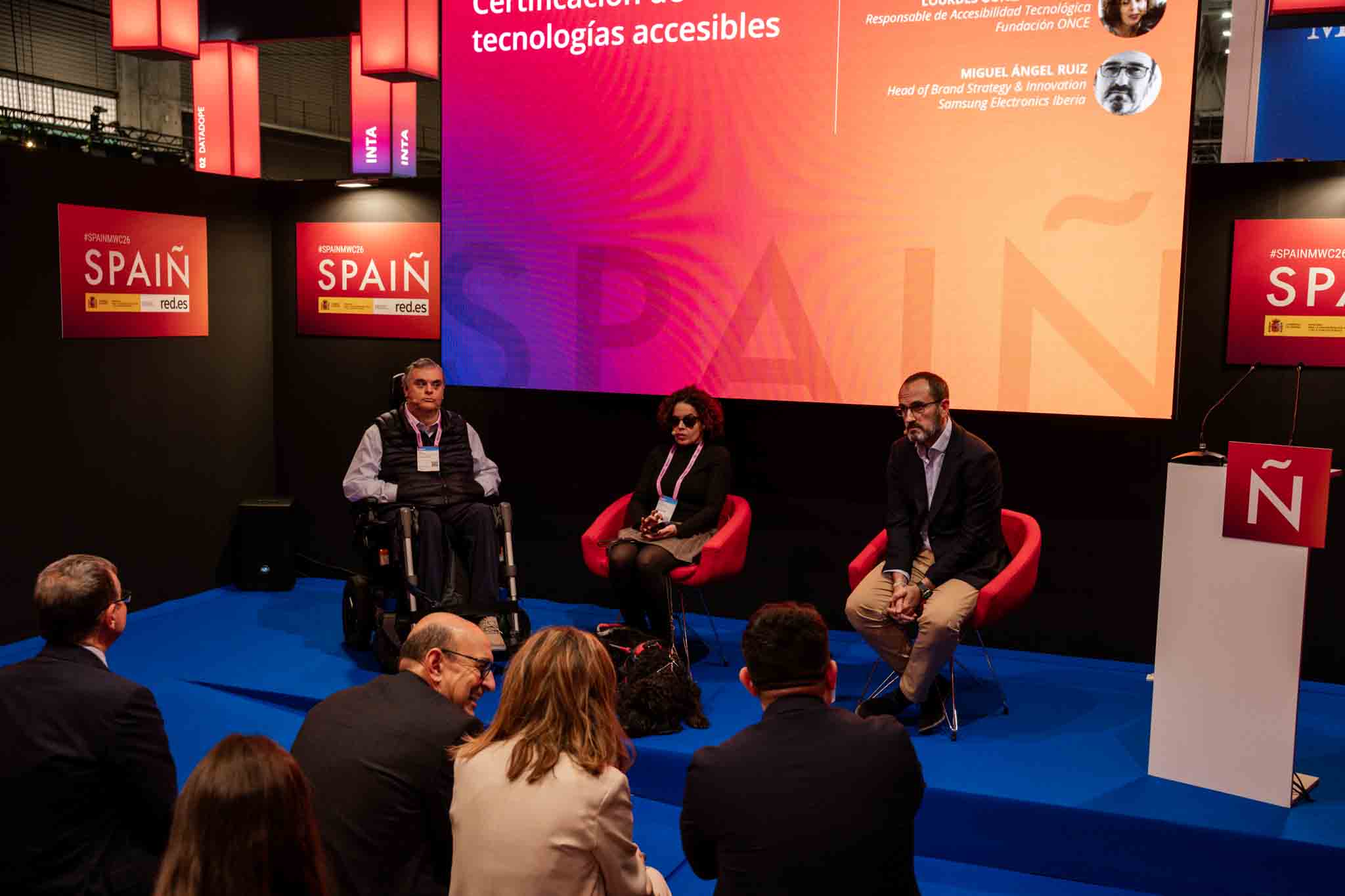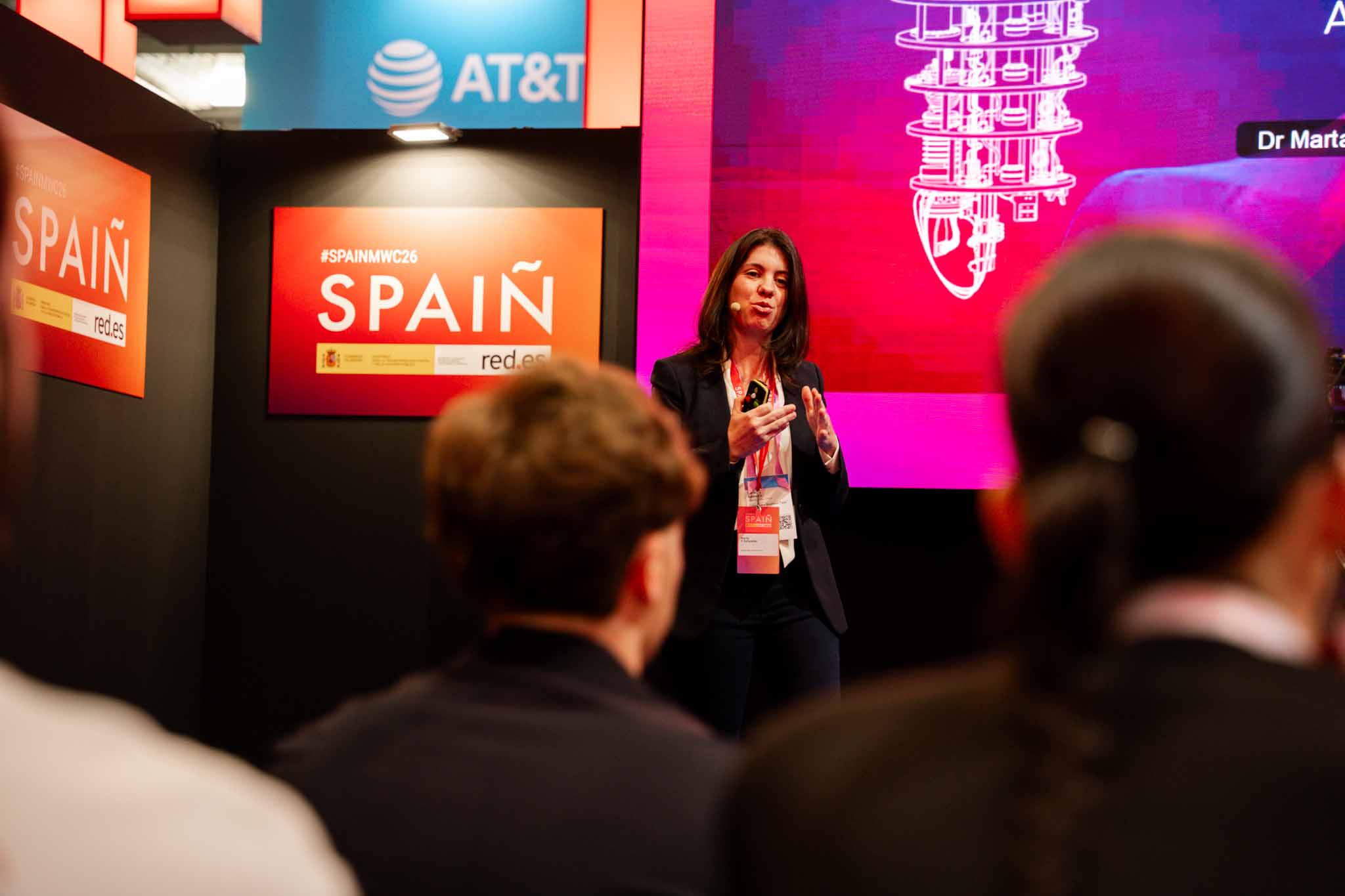 Empresarios/as, ejecutivos/as, expertos/as, autoridades y visitantes reunidos/as en el Pabellón de España durante MWC.