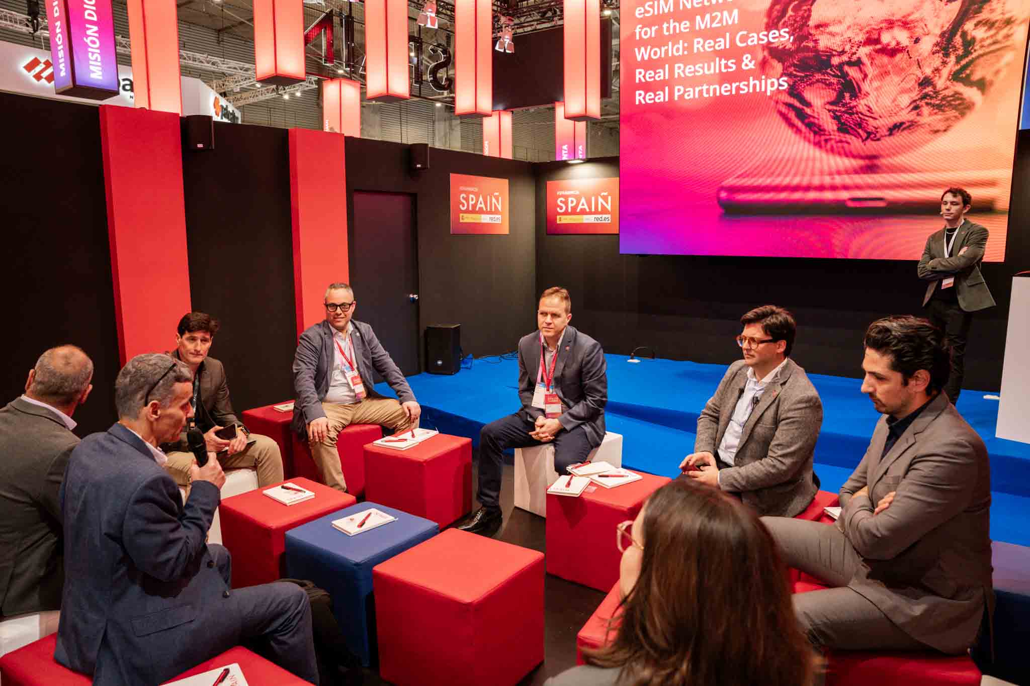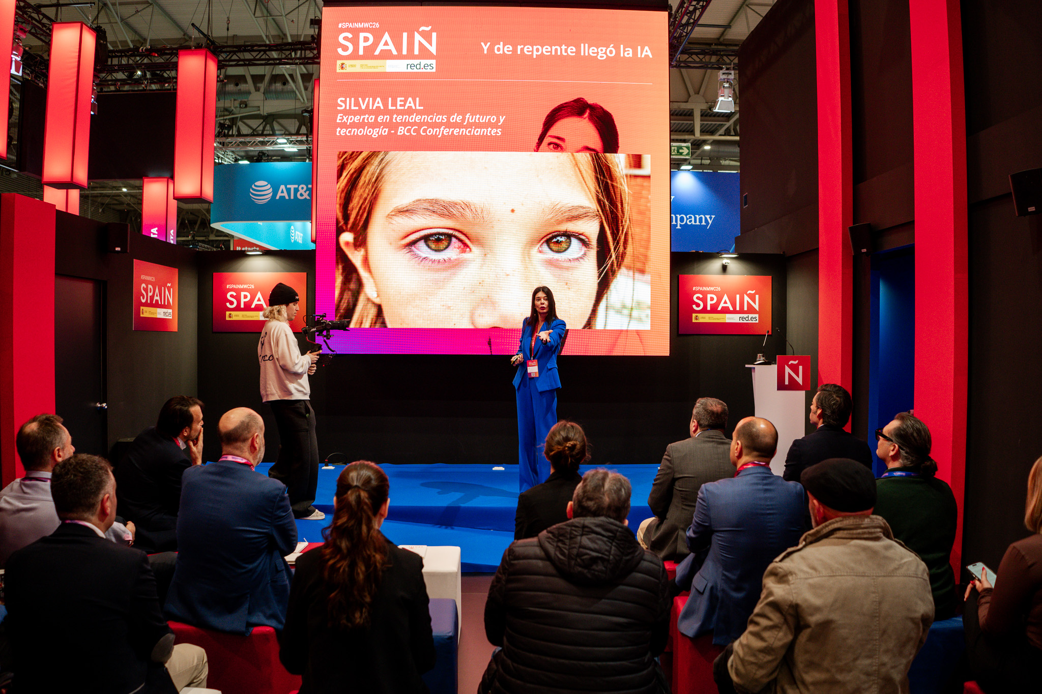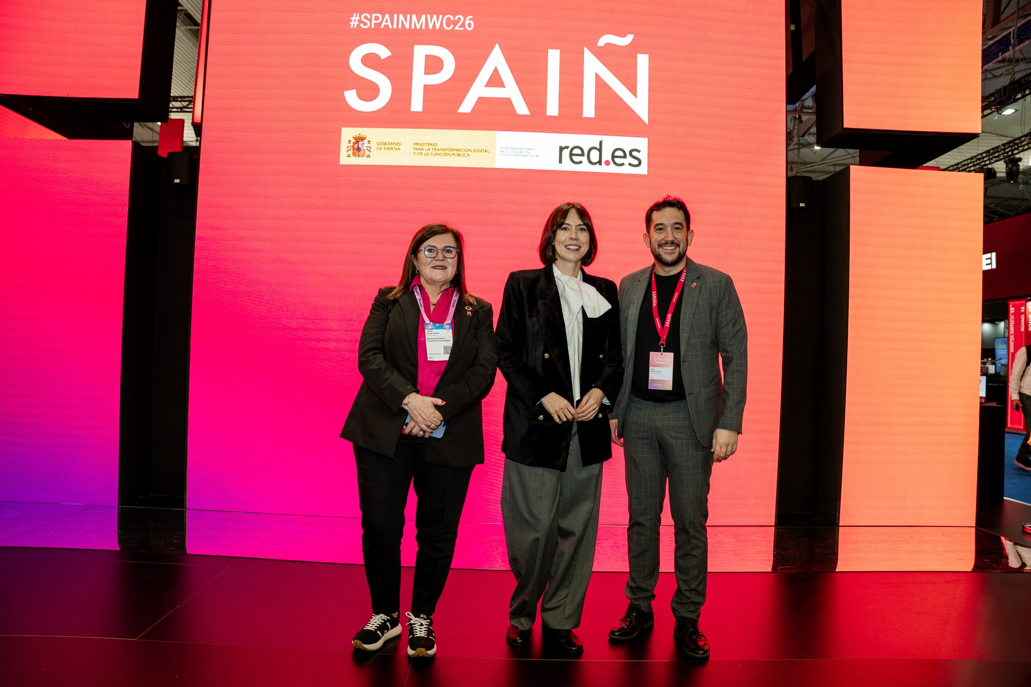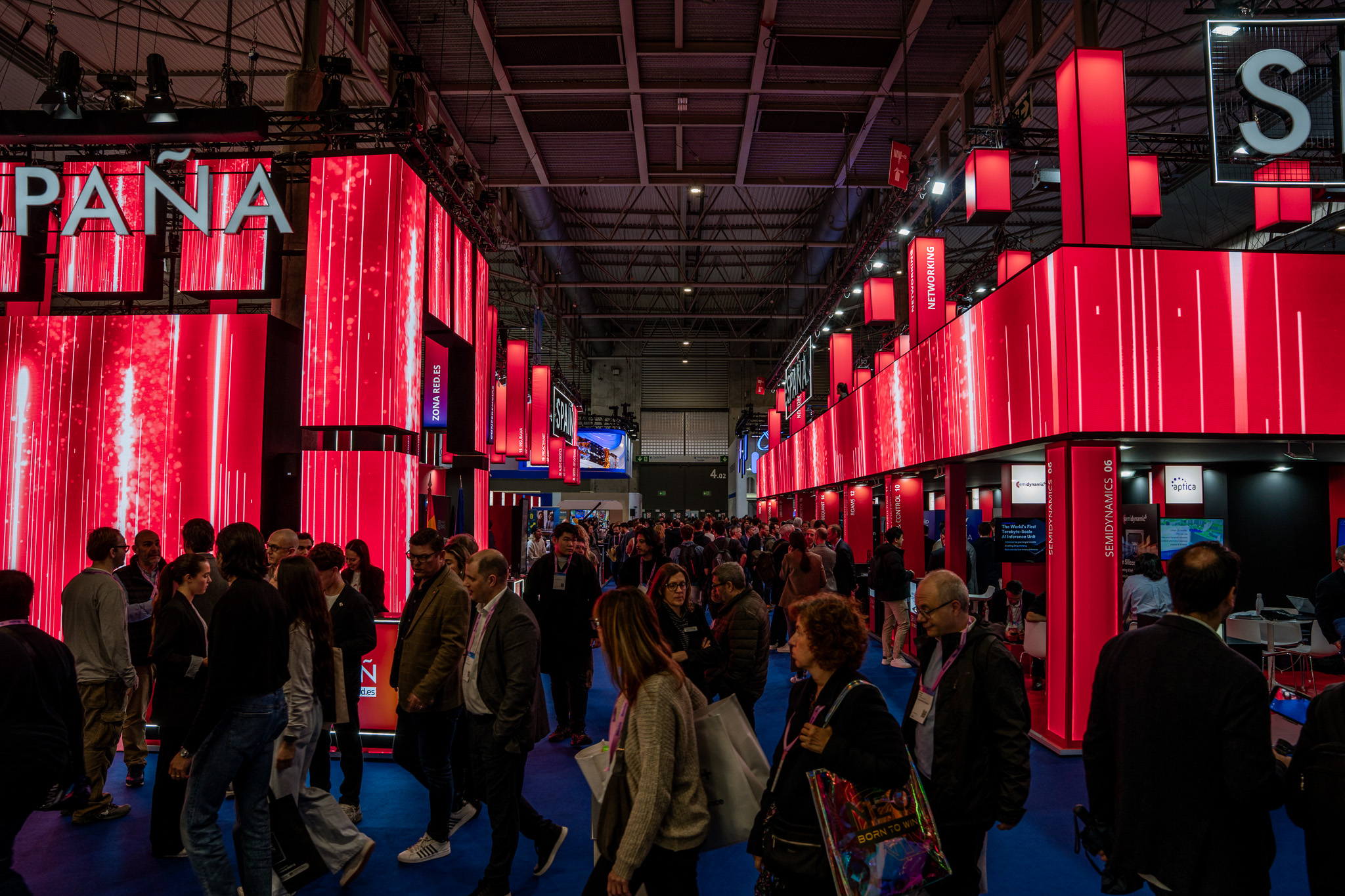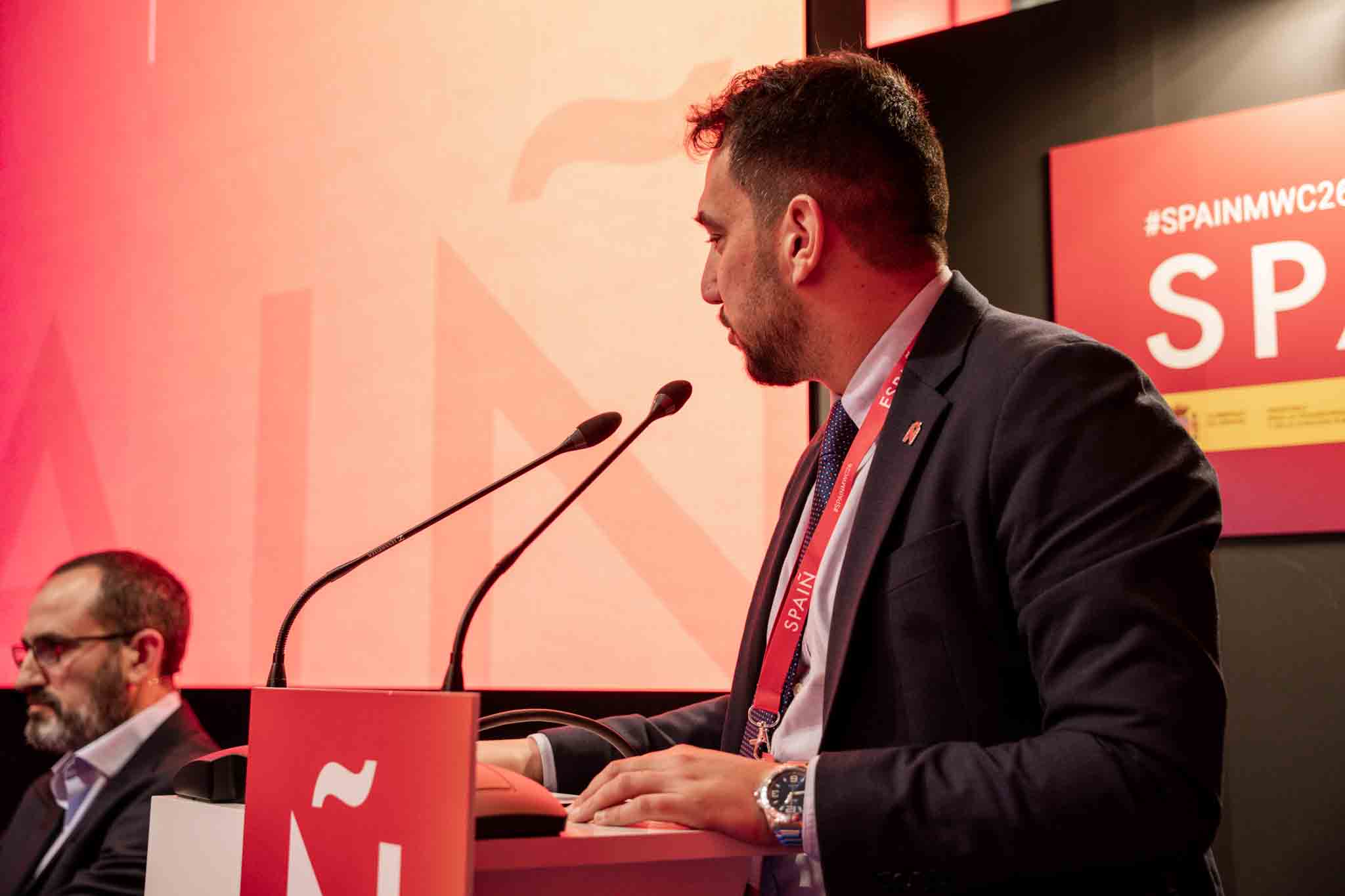 Empresarios/as, ejecutivos/as, expertos/as, autoridades y visitantes reunidos/as en el Pabellón de España durante MWC.