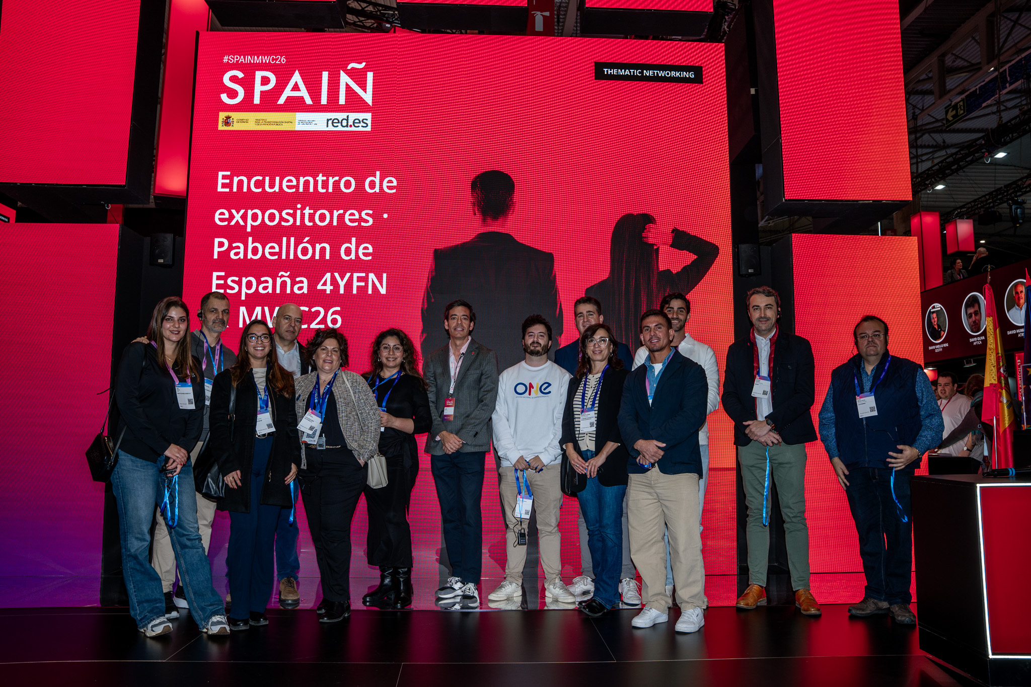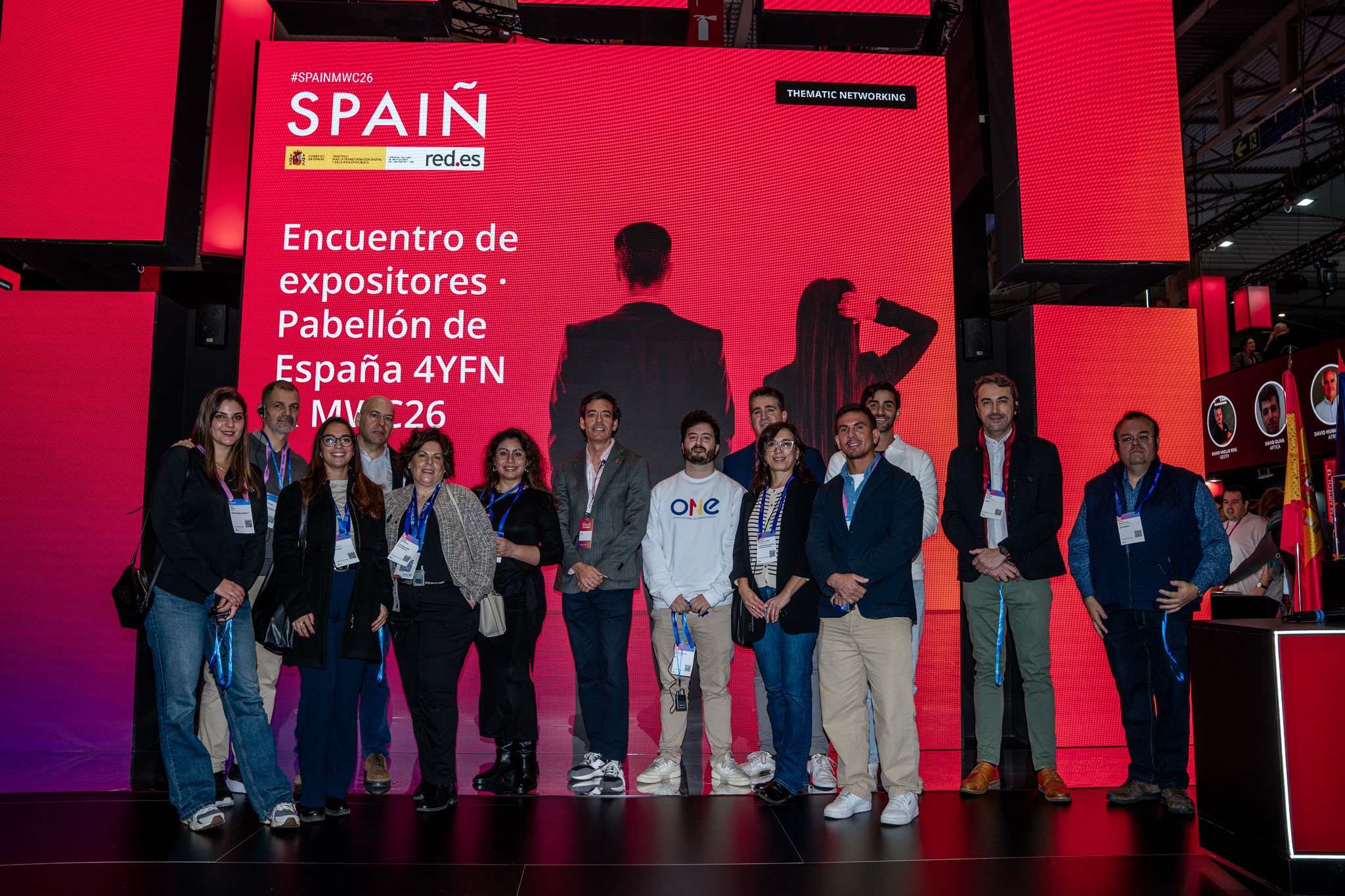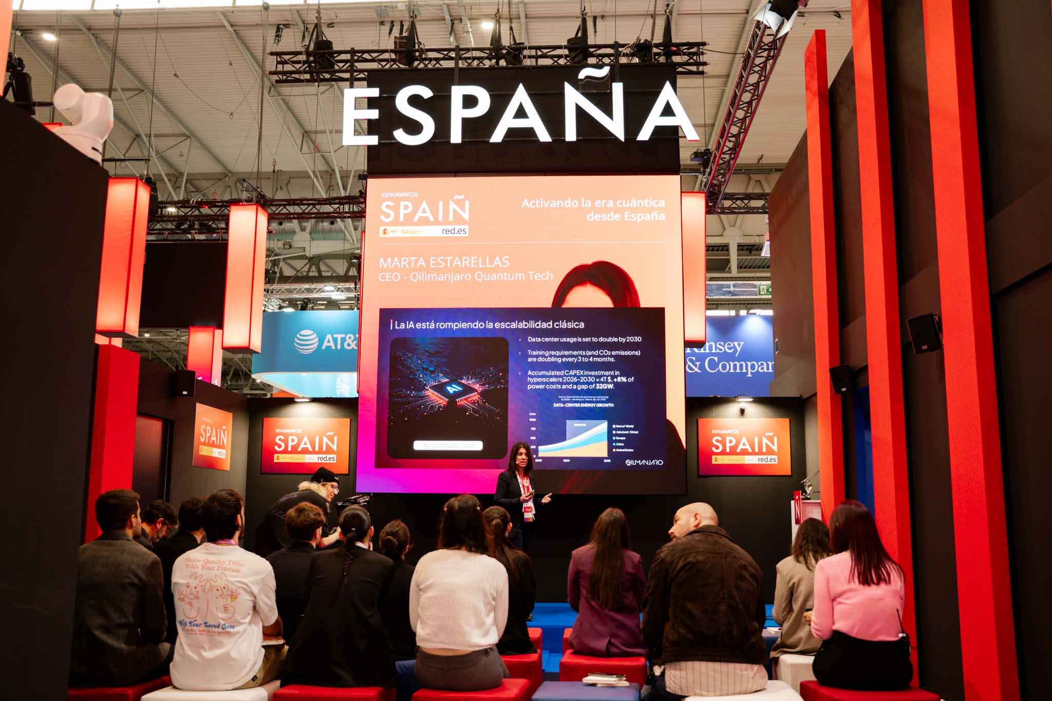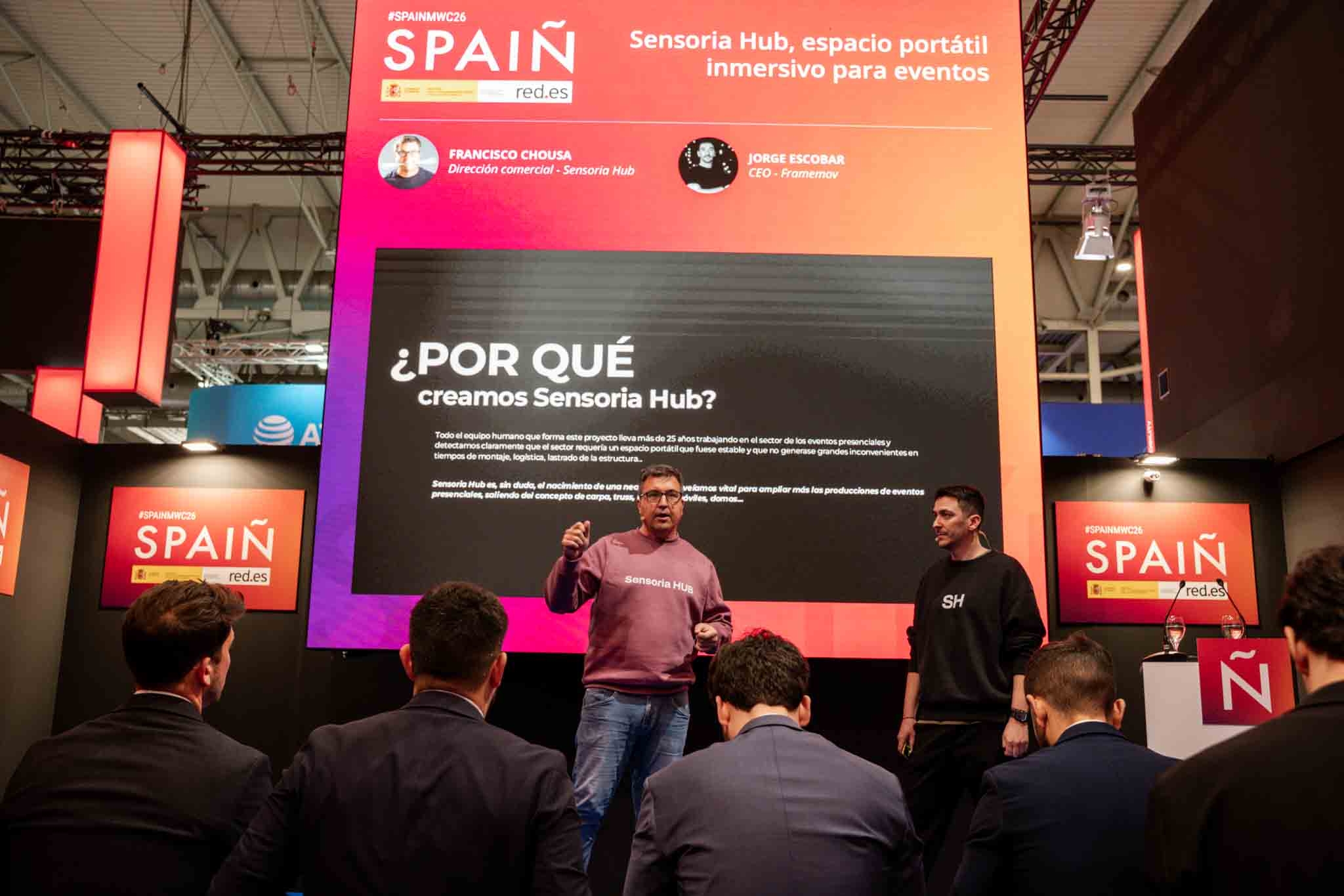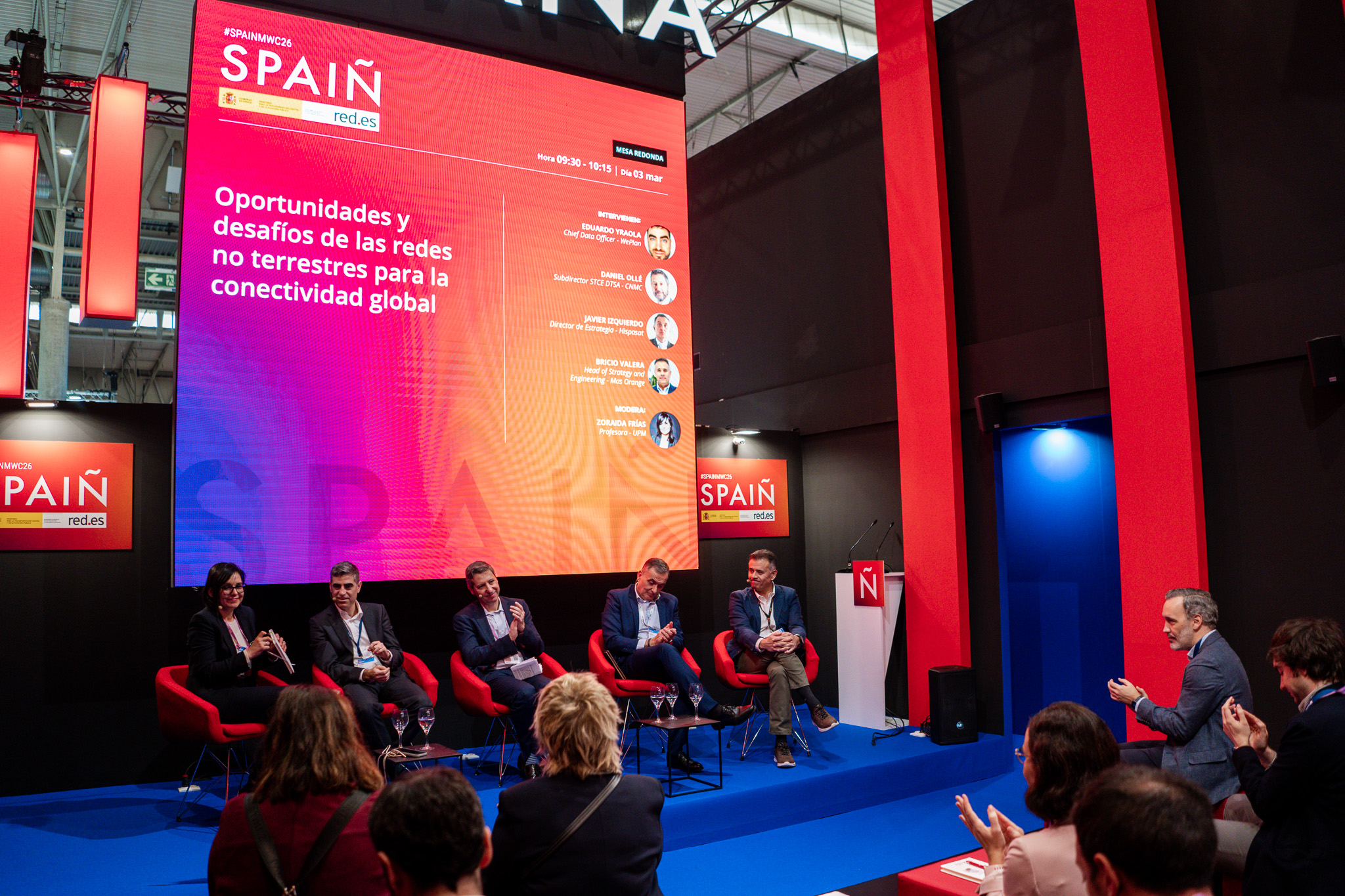 Empresarios/as, ejecutivos/as, expertos/as, autoridades y visitantes reunidos/as en el Pabellón de España durante MWC.