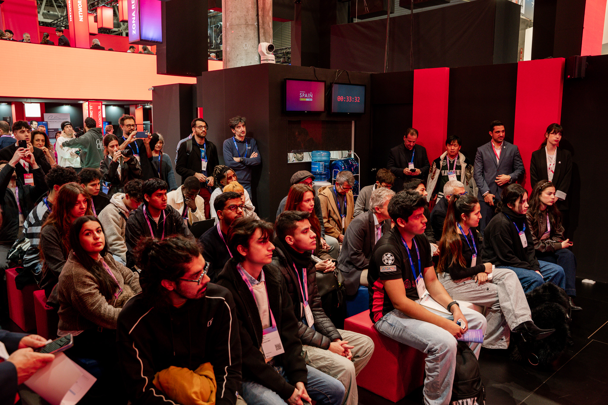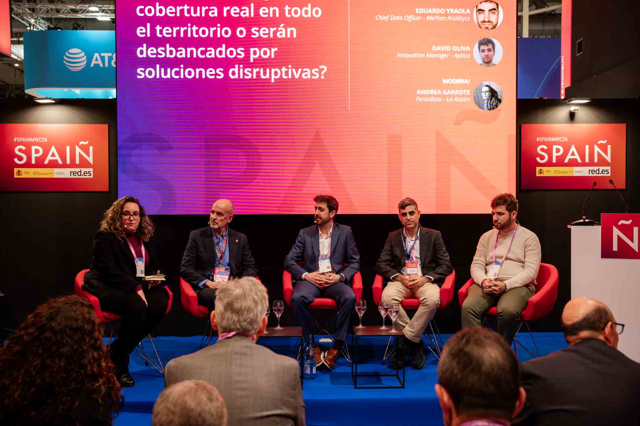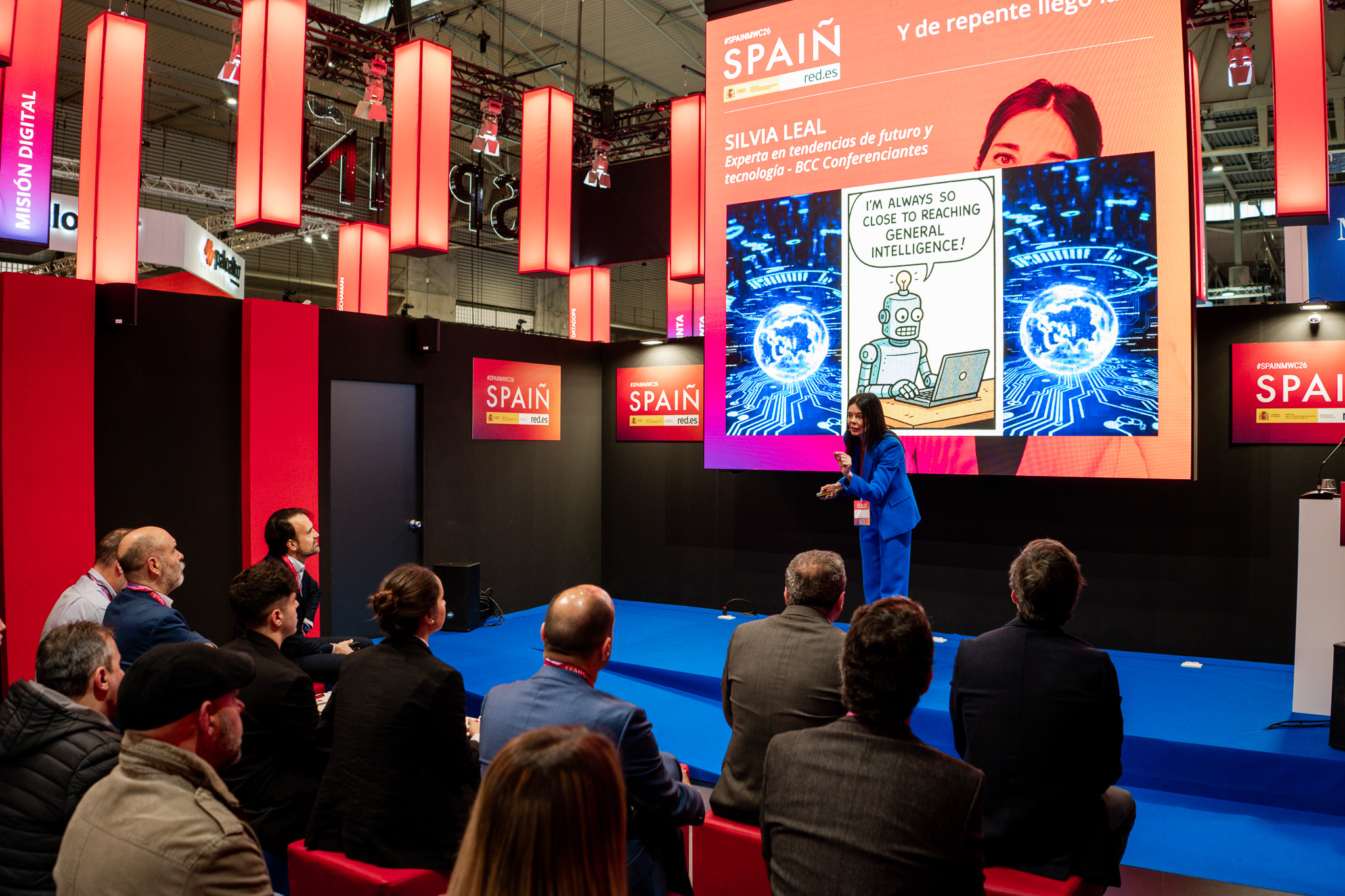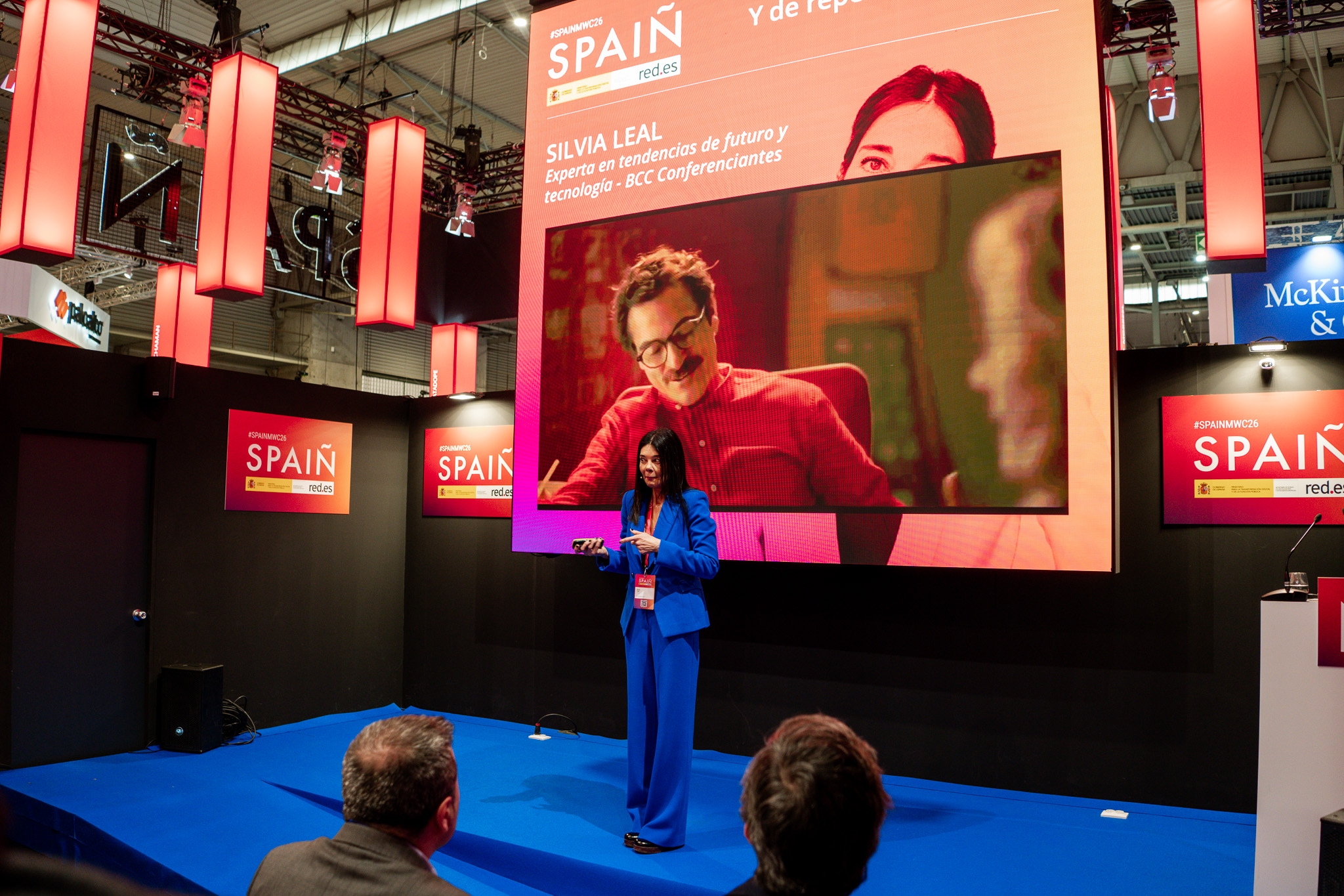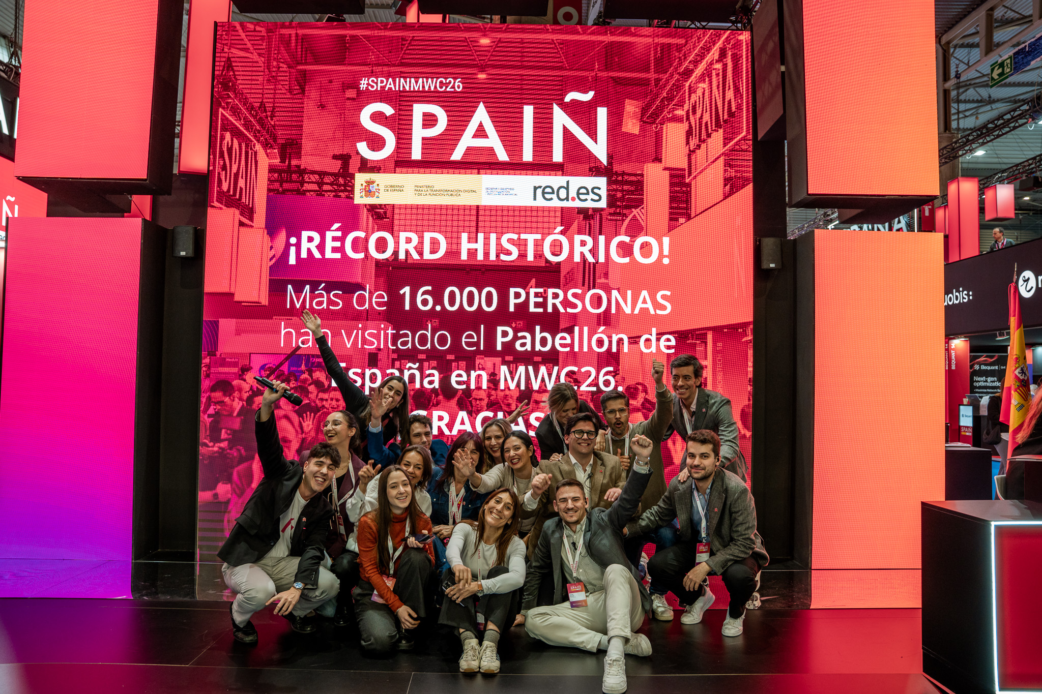 Empresarios/as, ejecutivos/as, expertos/as, autoridades y visitantes reunidos/as en el Pabellón de España durante MWC.