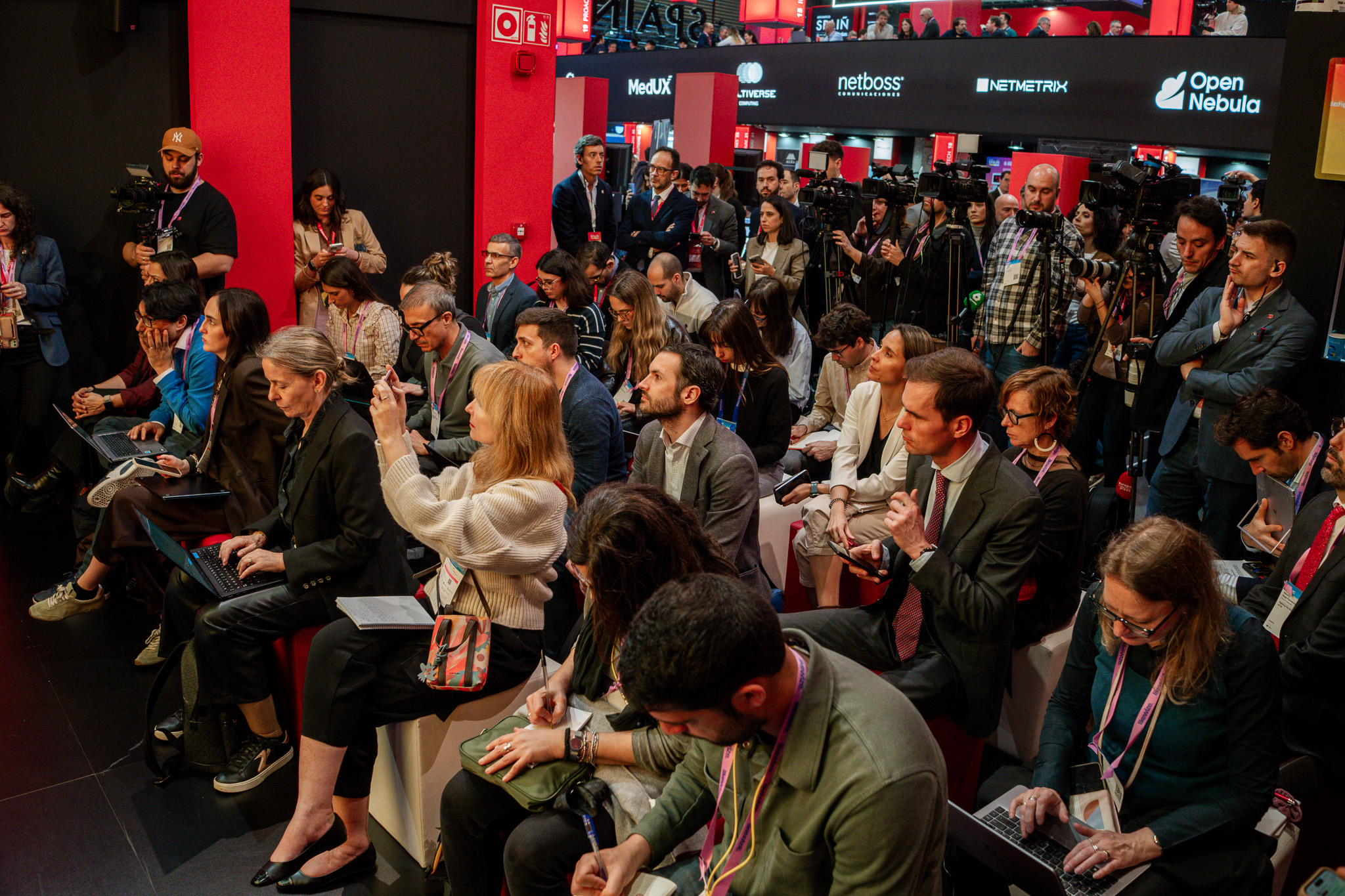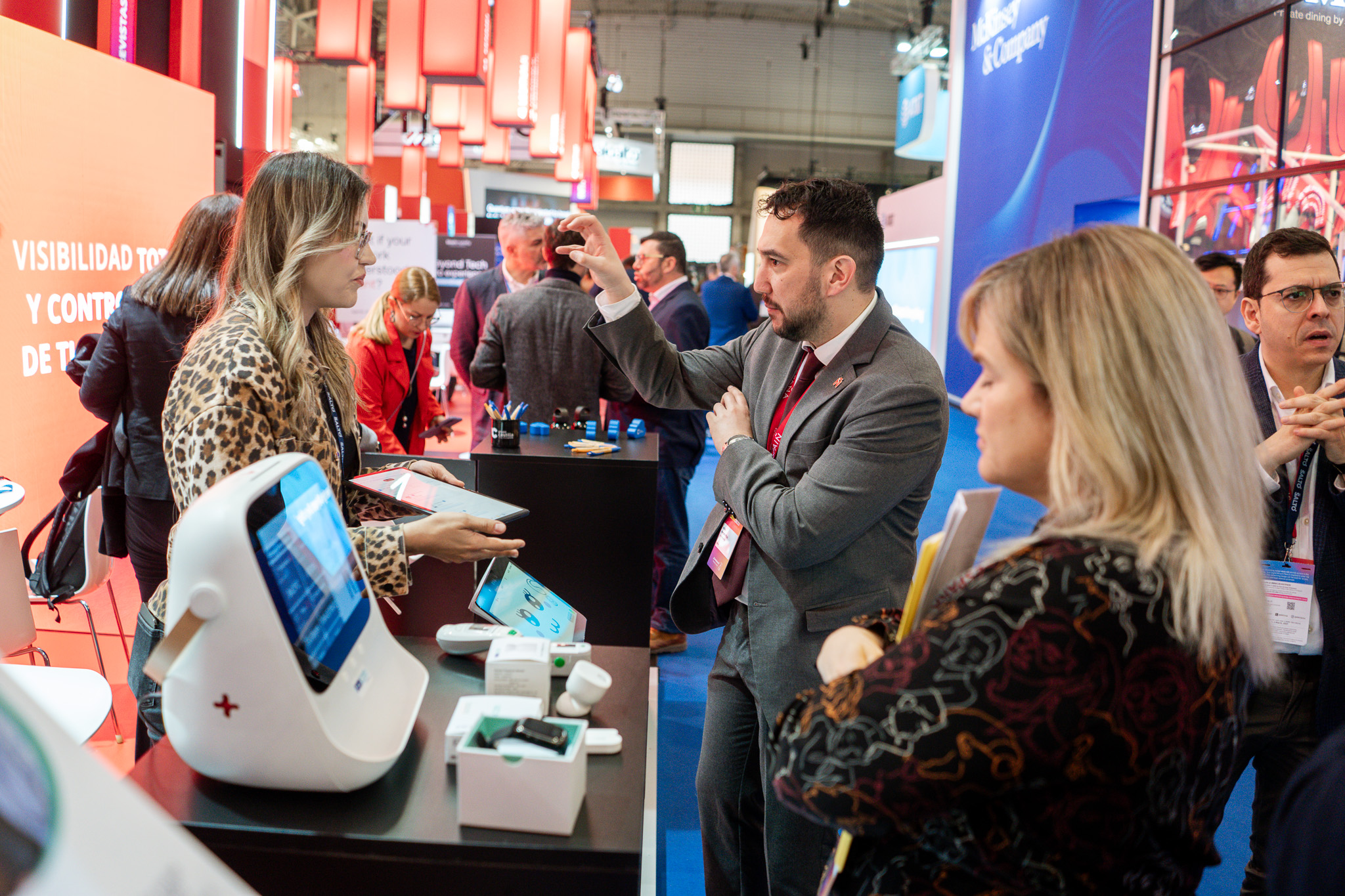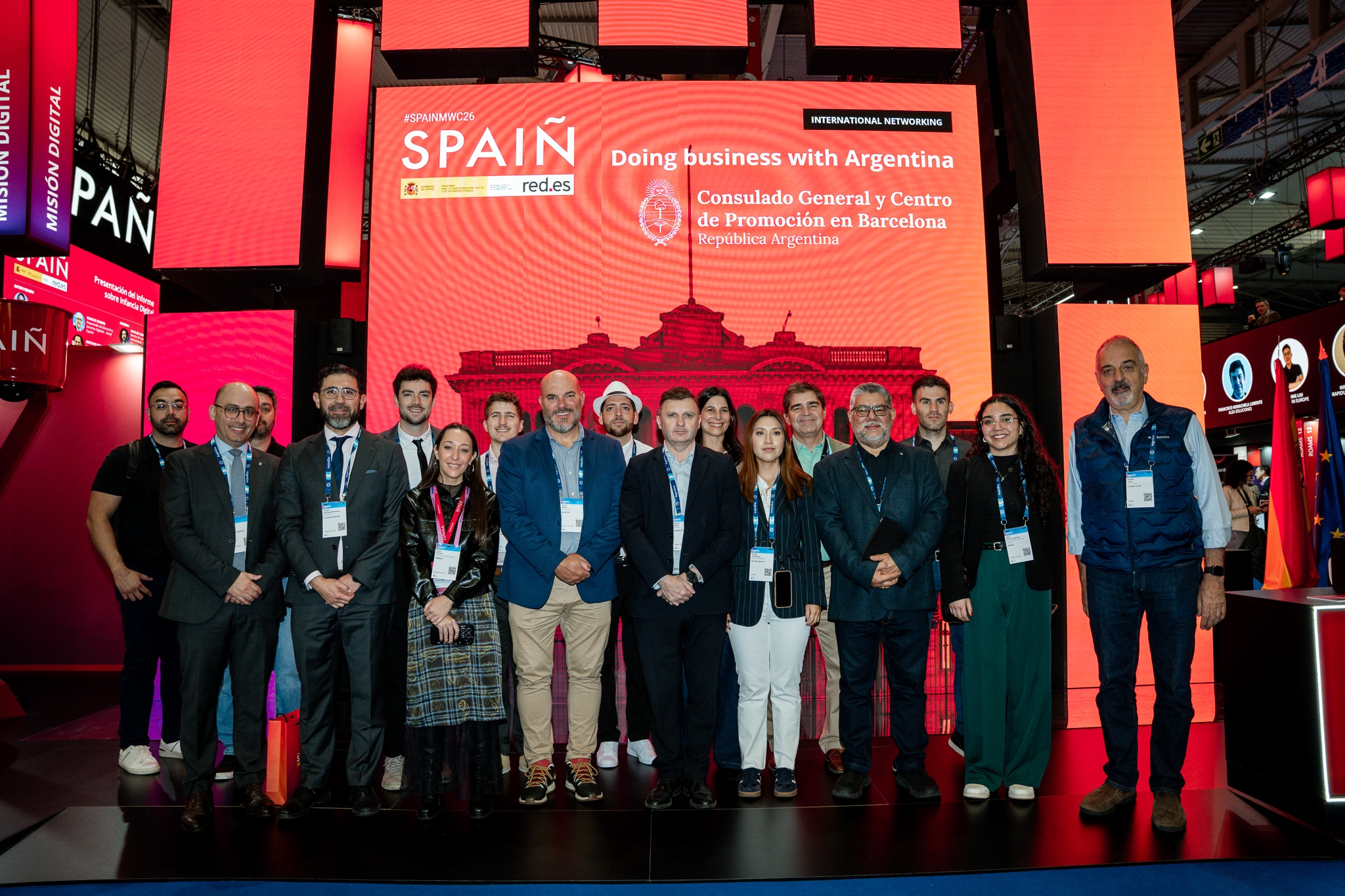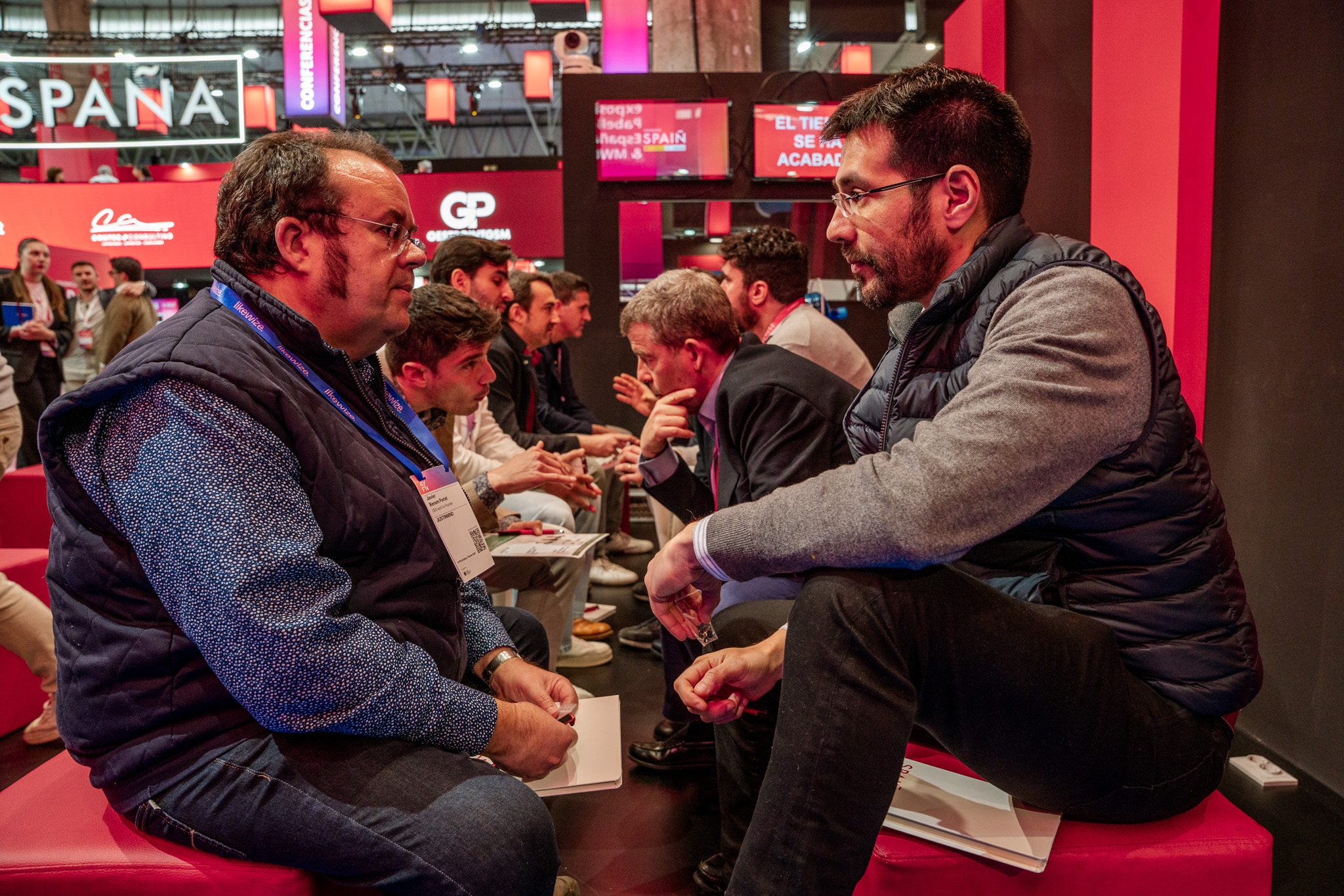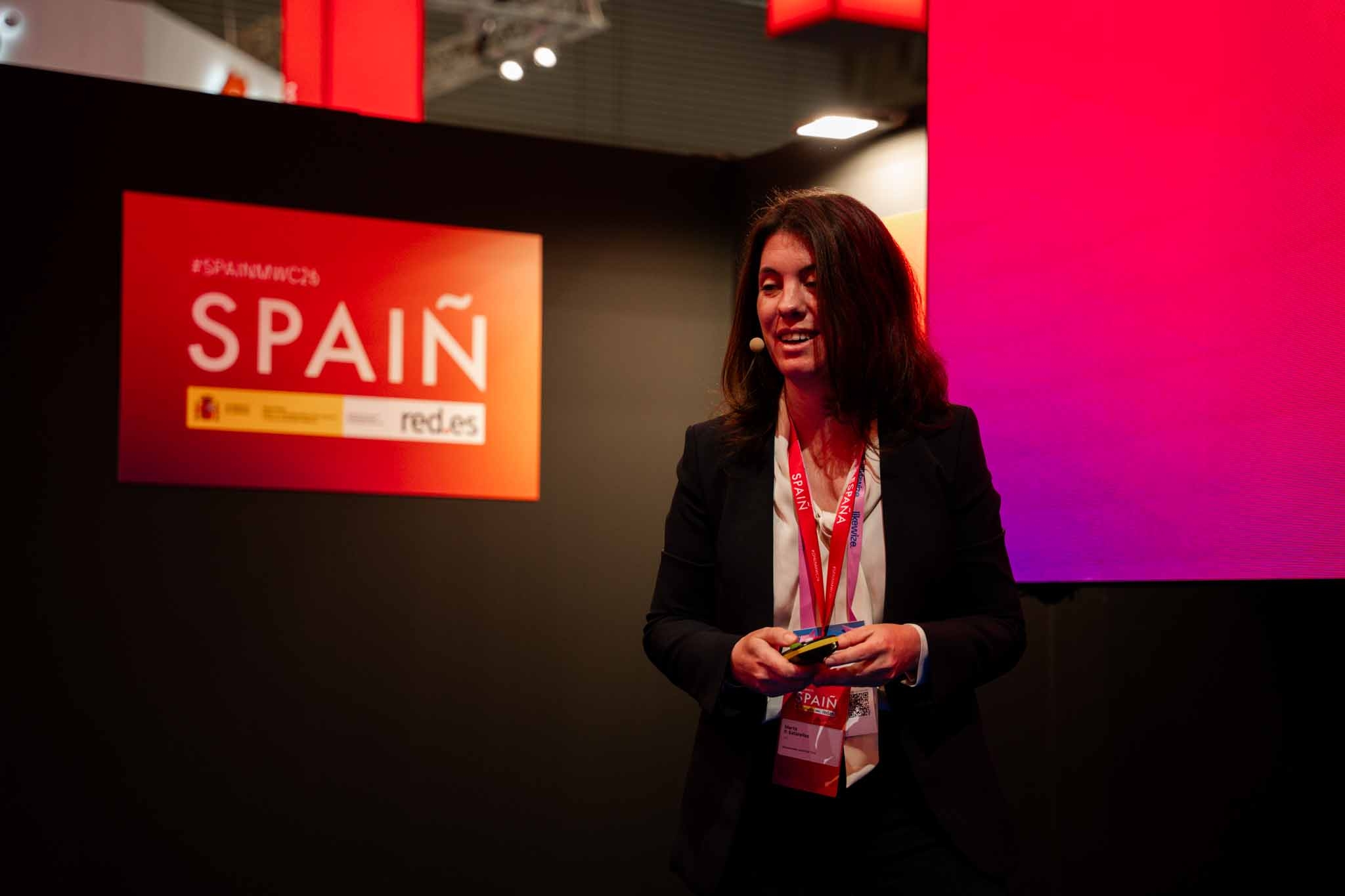 Empresarios/as, ejecutivos/as, expertos/as, autoridades y visitantes reunidos/as en el Pabellón de España durante MWC.