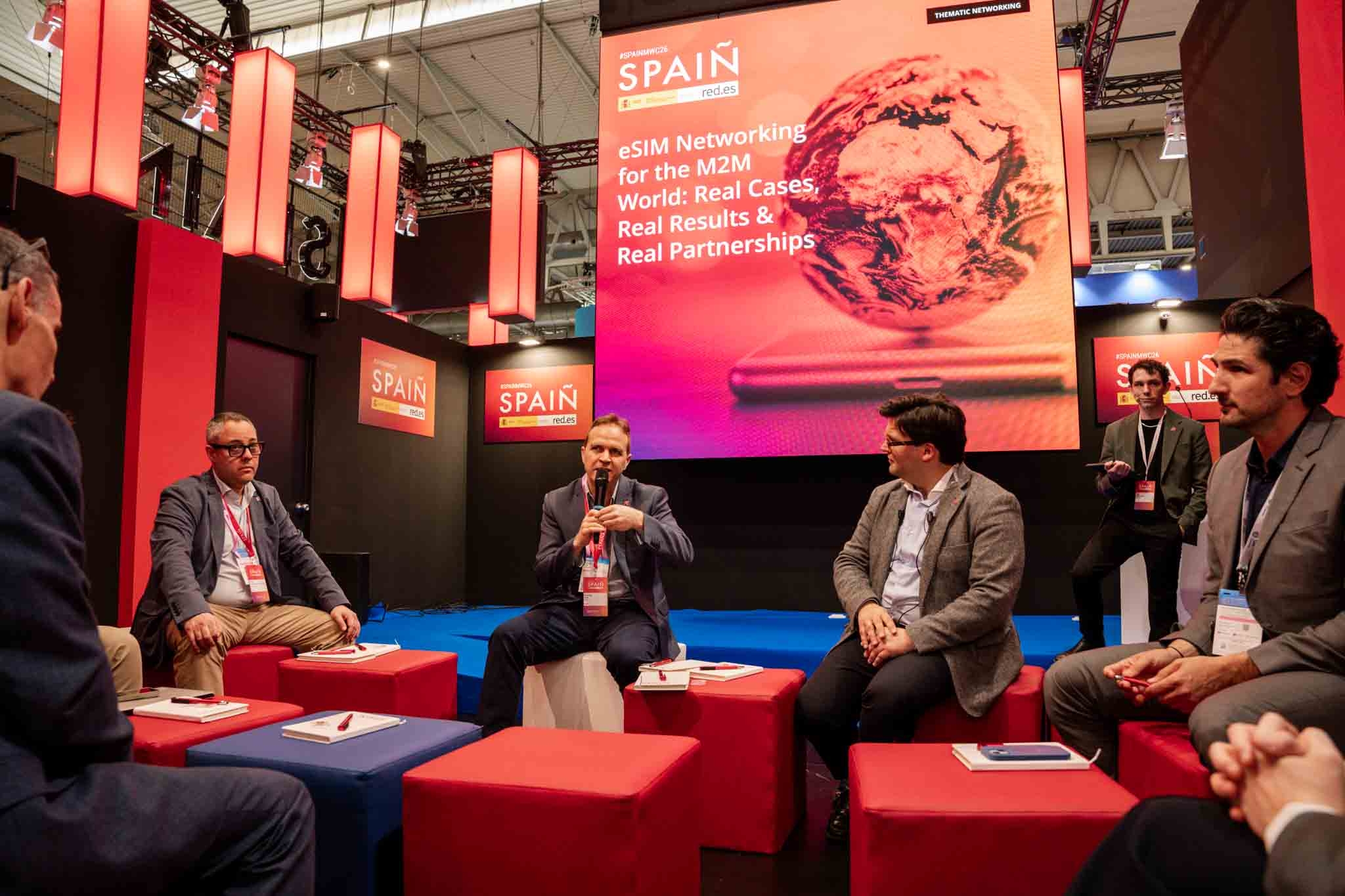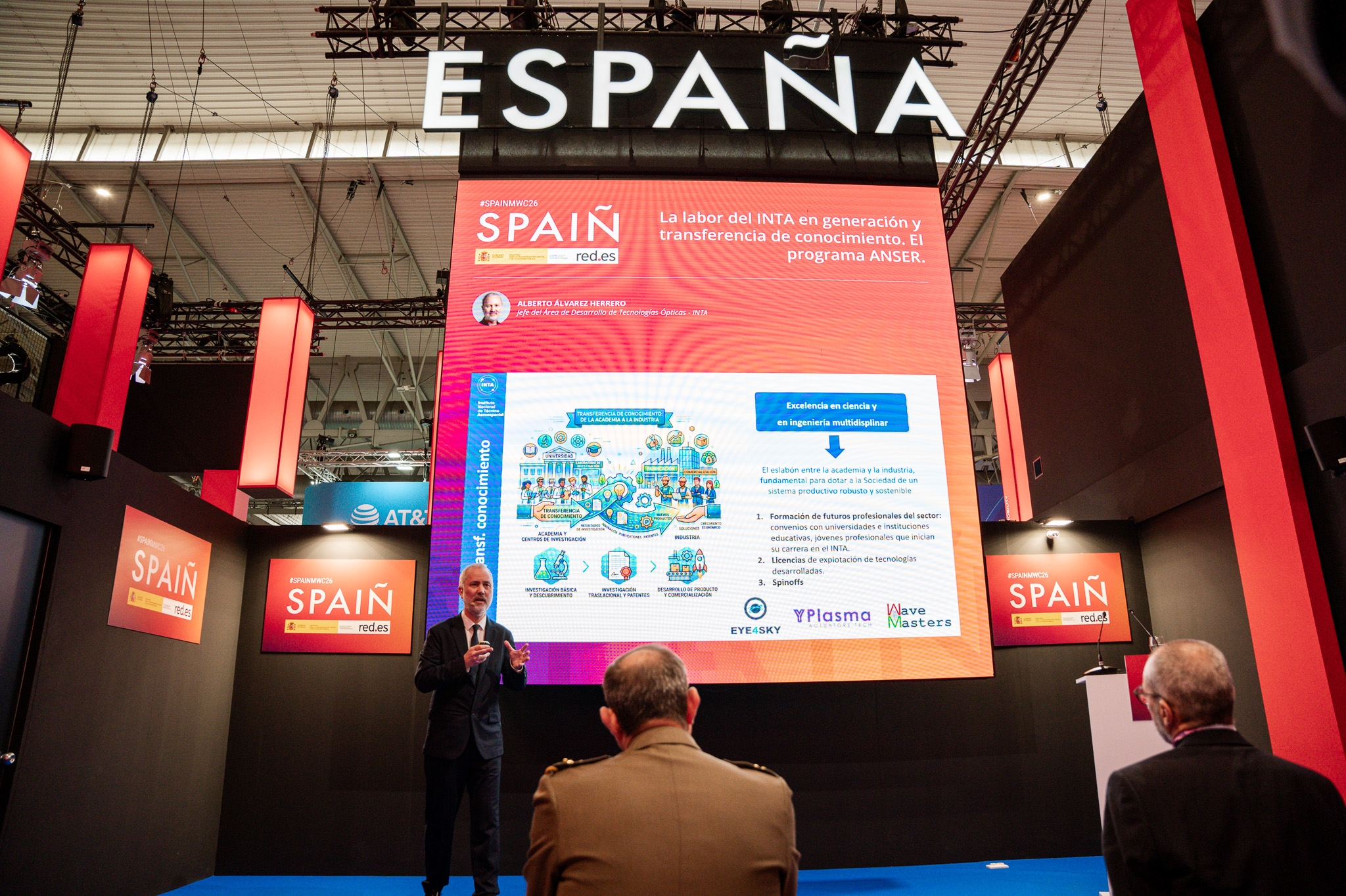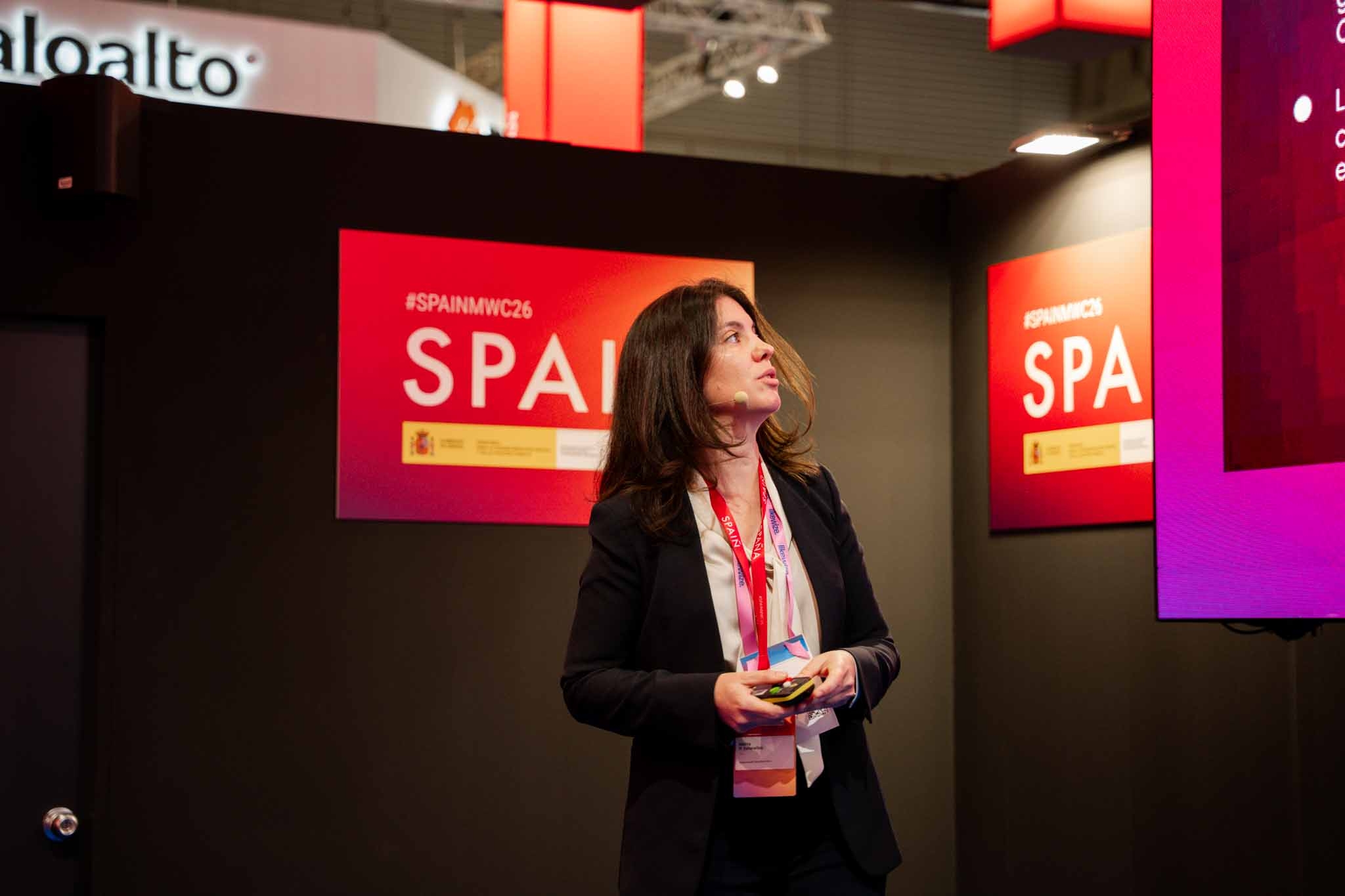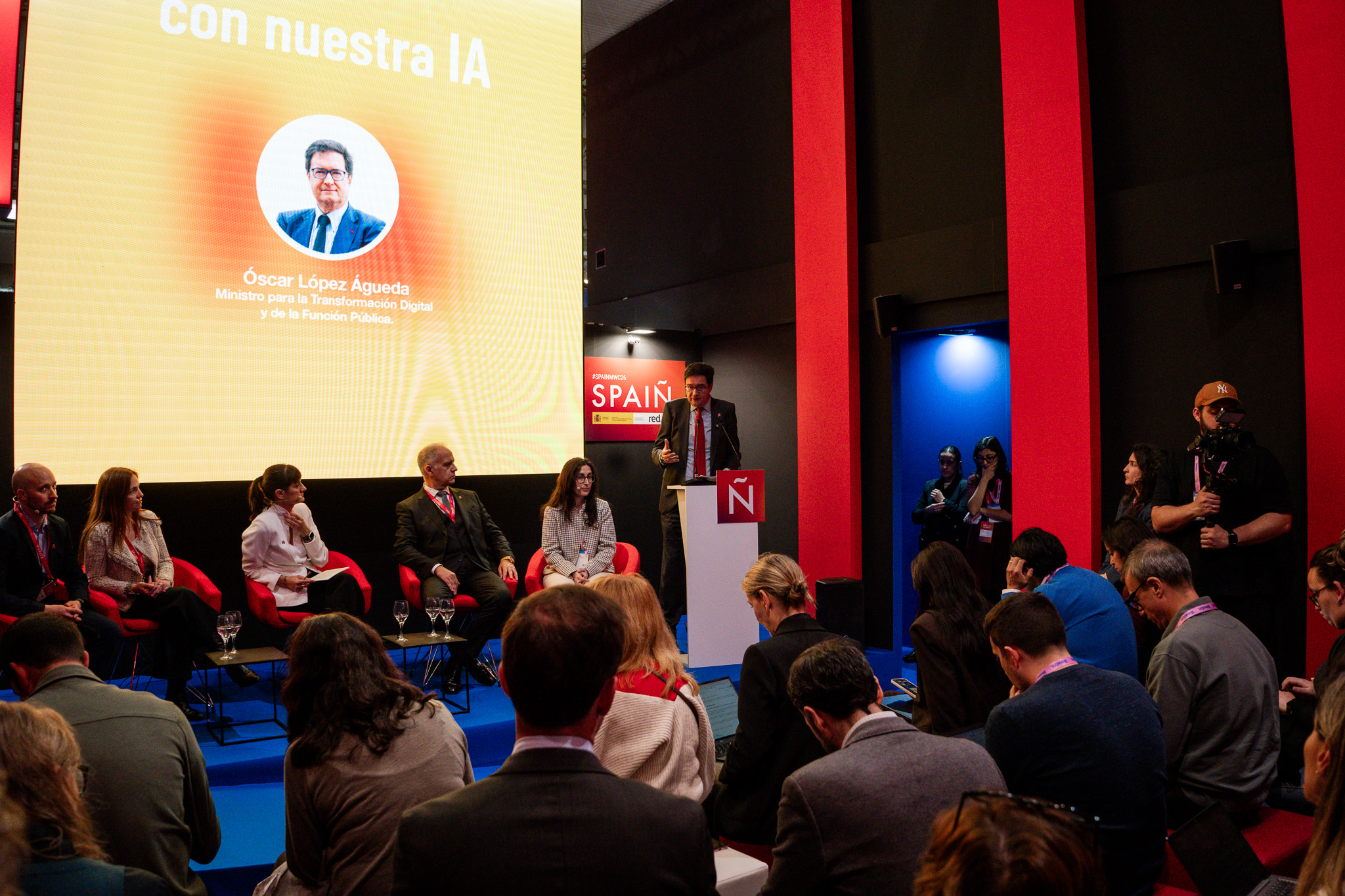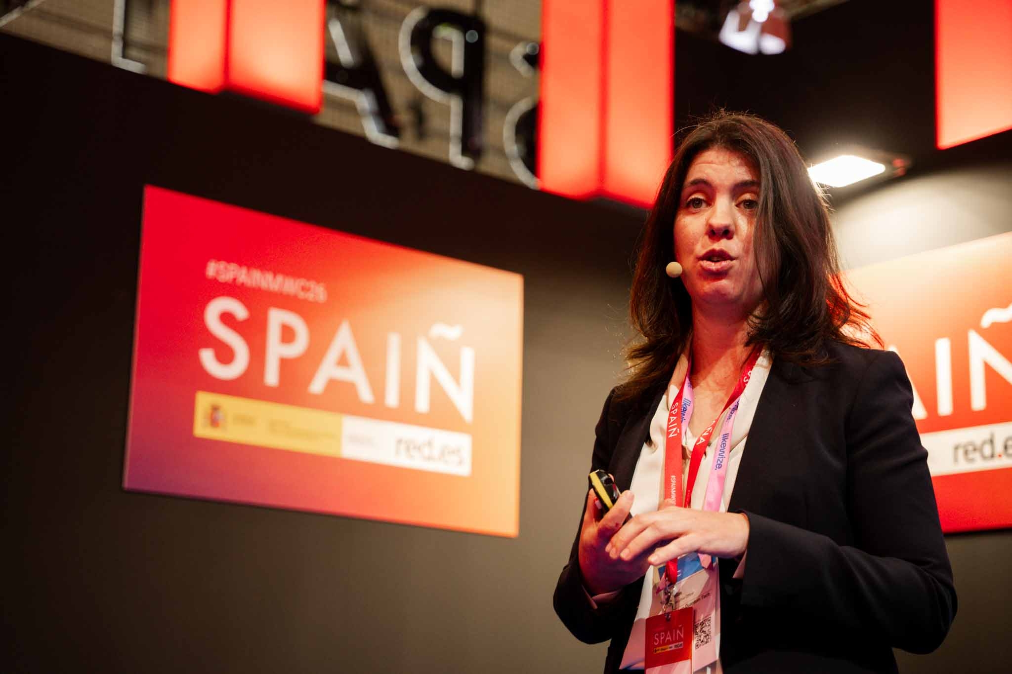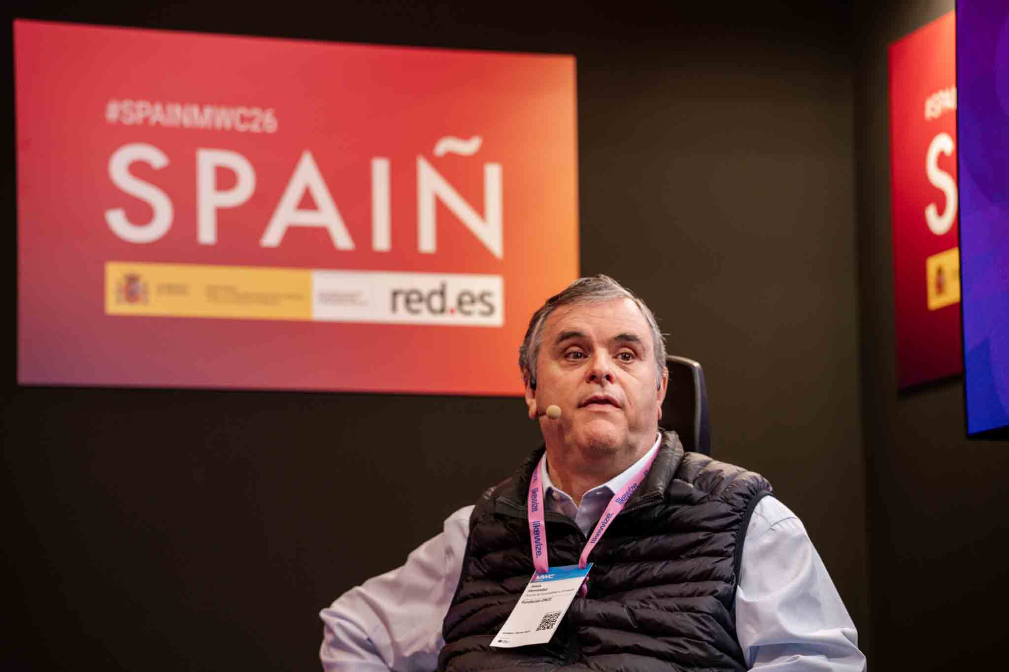 Empresarios/as, ejecutivos/as, expertos/as, autoridades y visitantes reunidos/as en el Pabellón de España durante MWC.