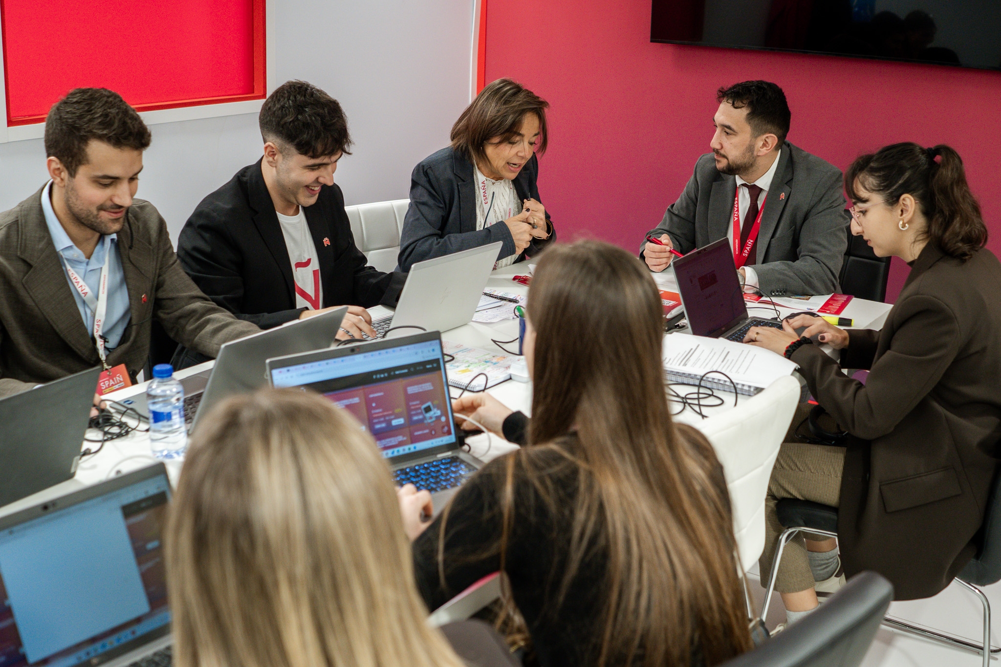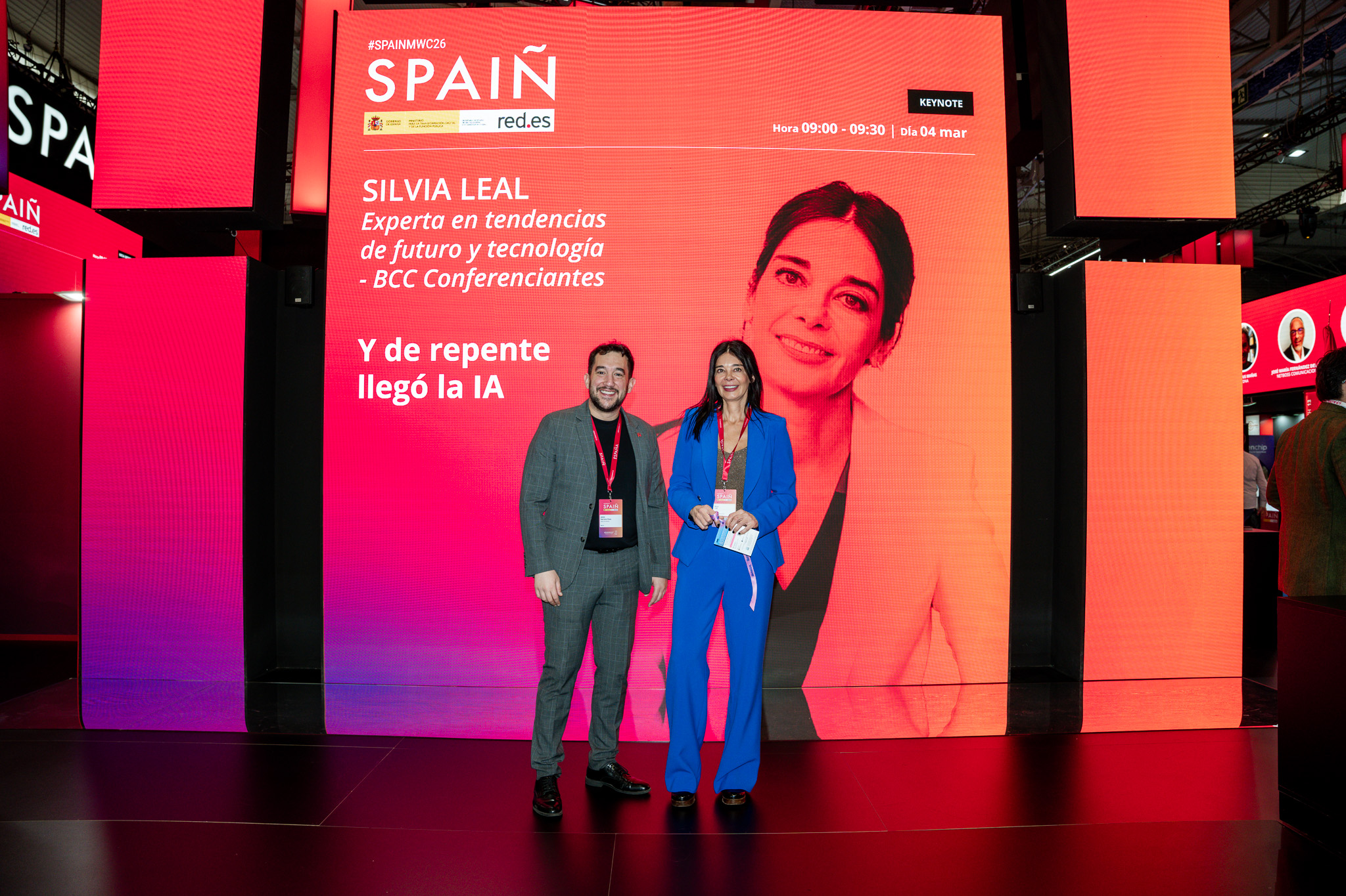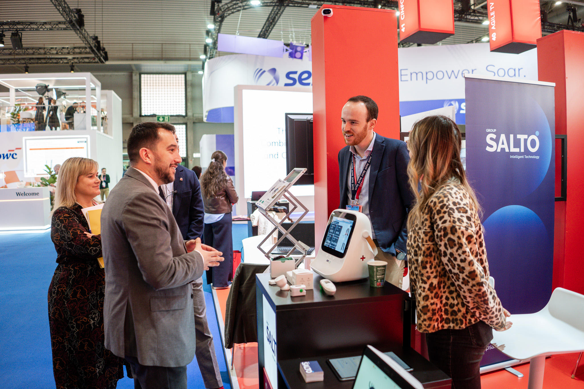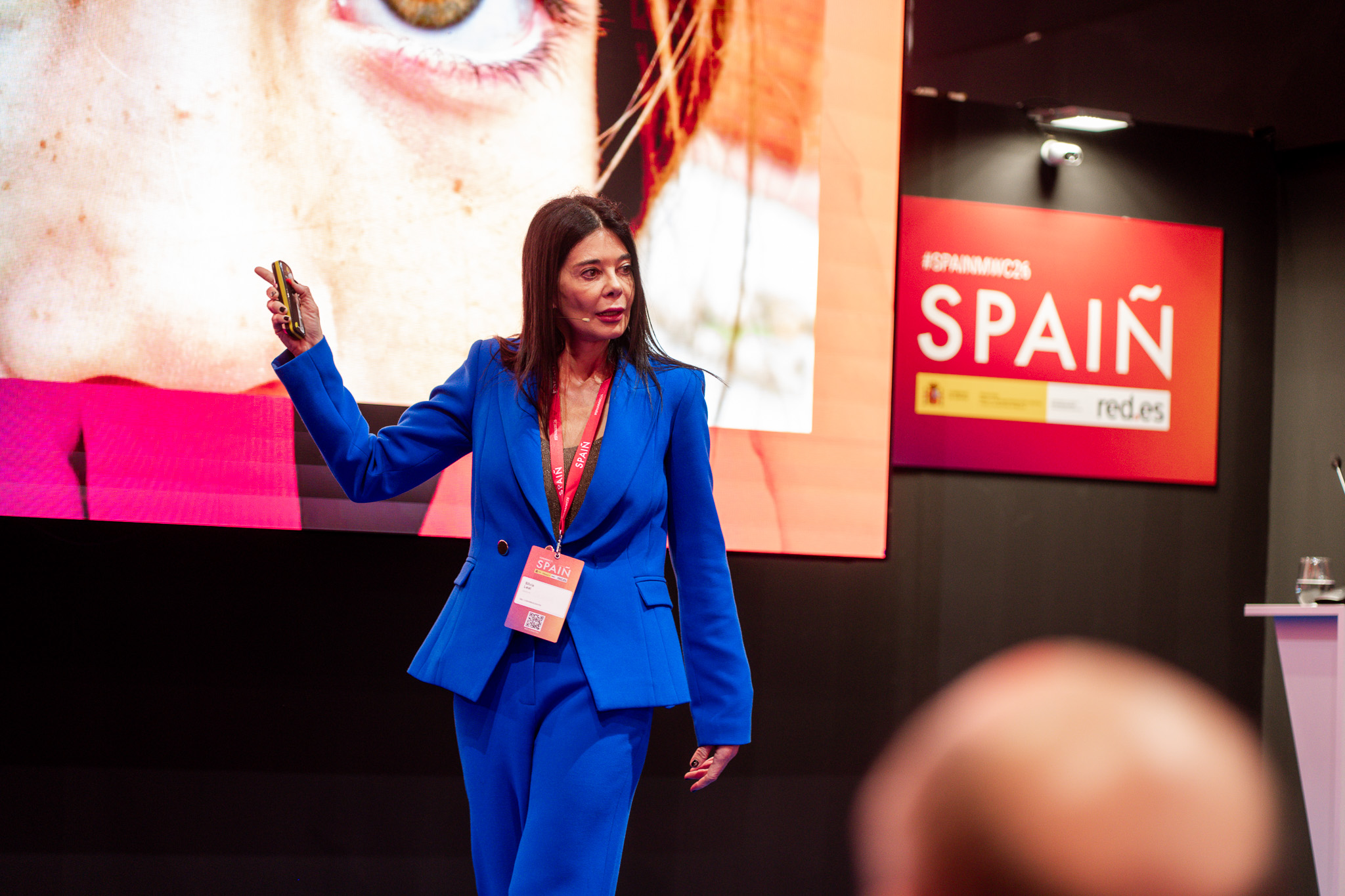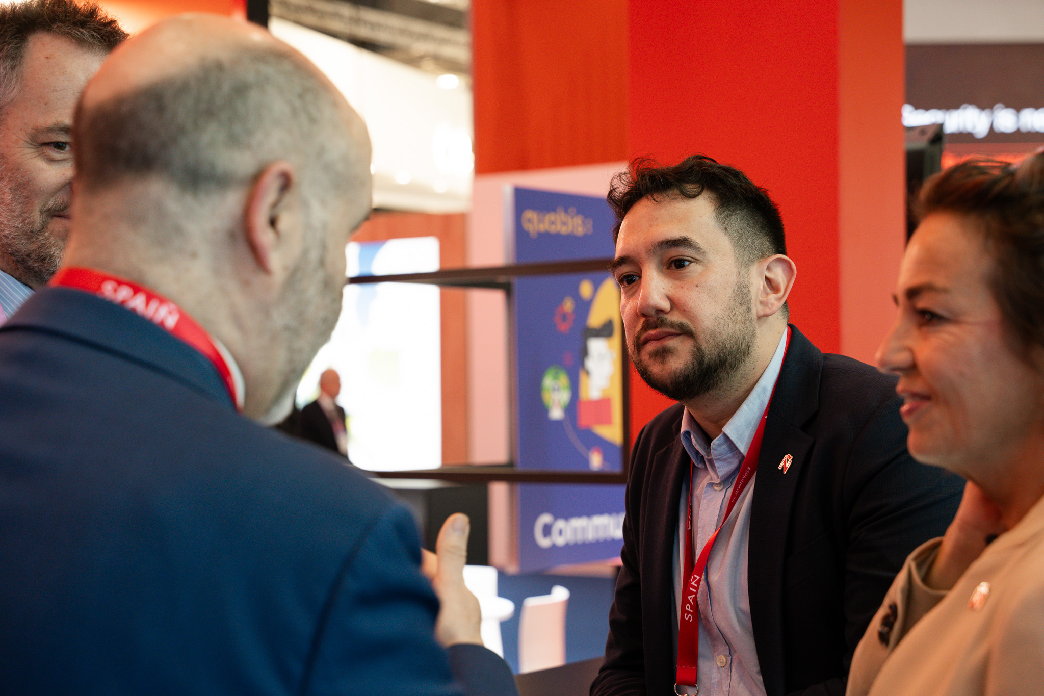 Empresarios/as, ejecutivos/as, expertos/as, autoridades y visitantes reunidos/as en el Pabellón de España durante MWC.
