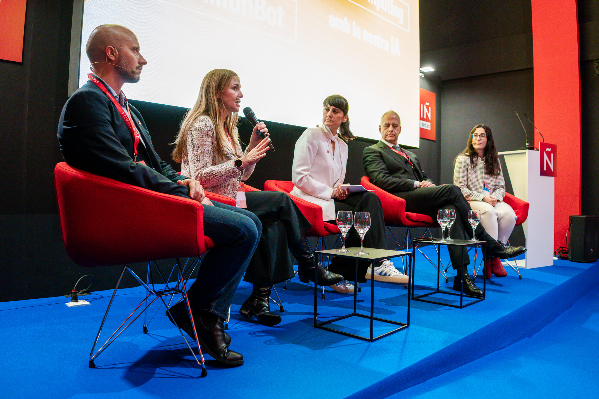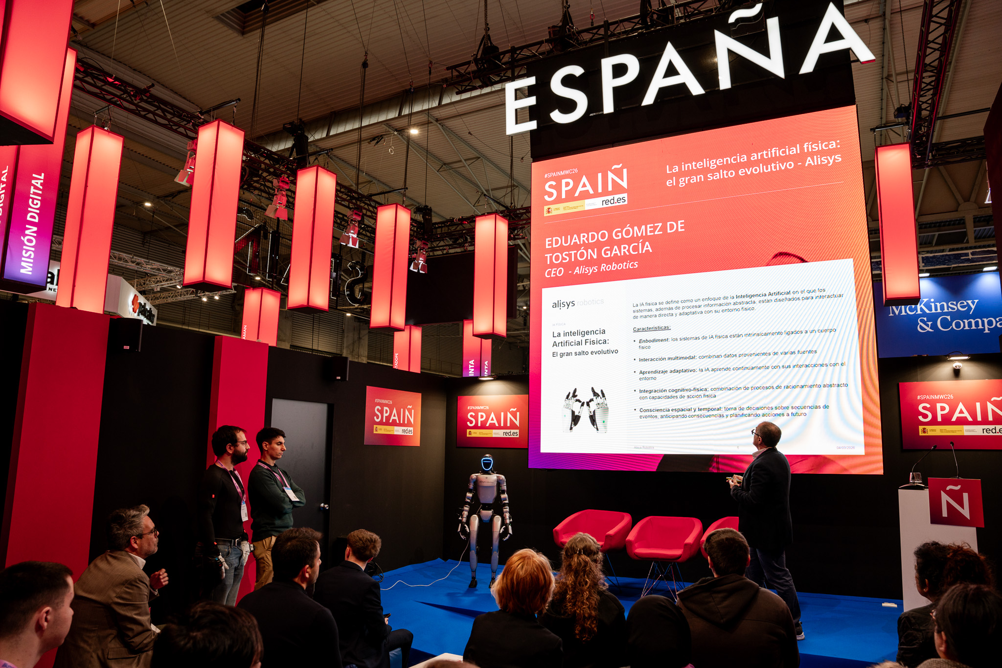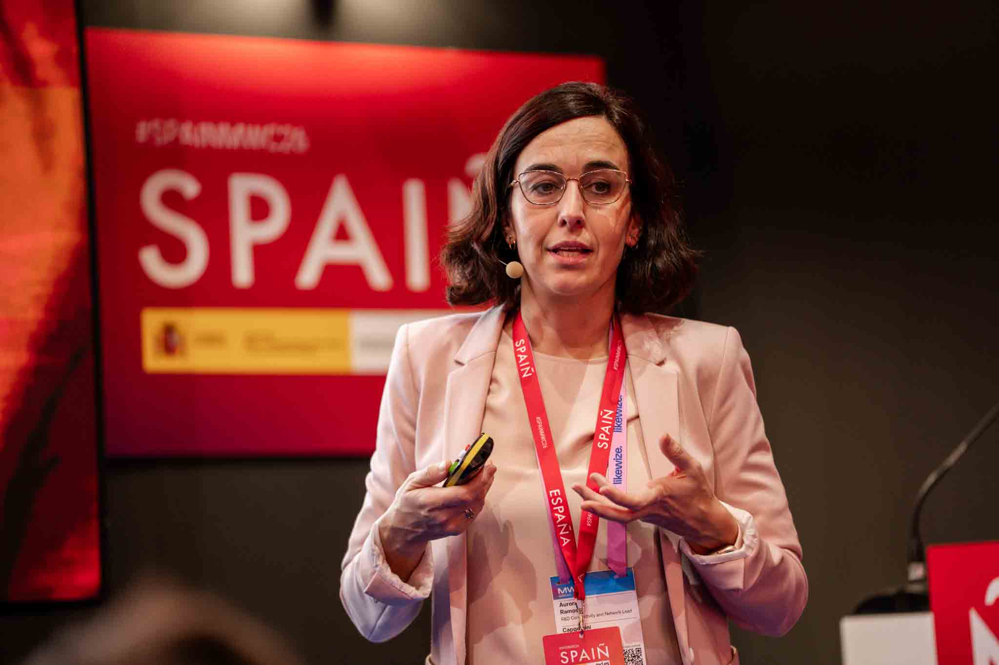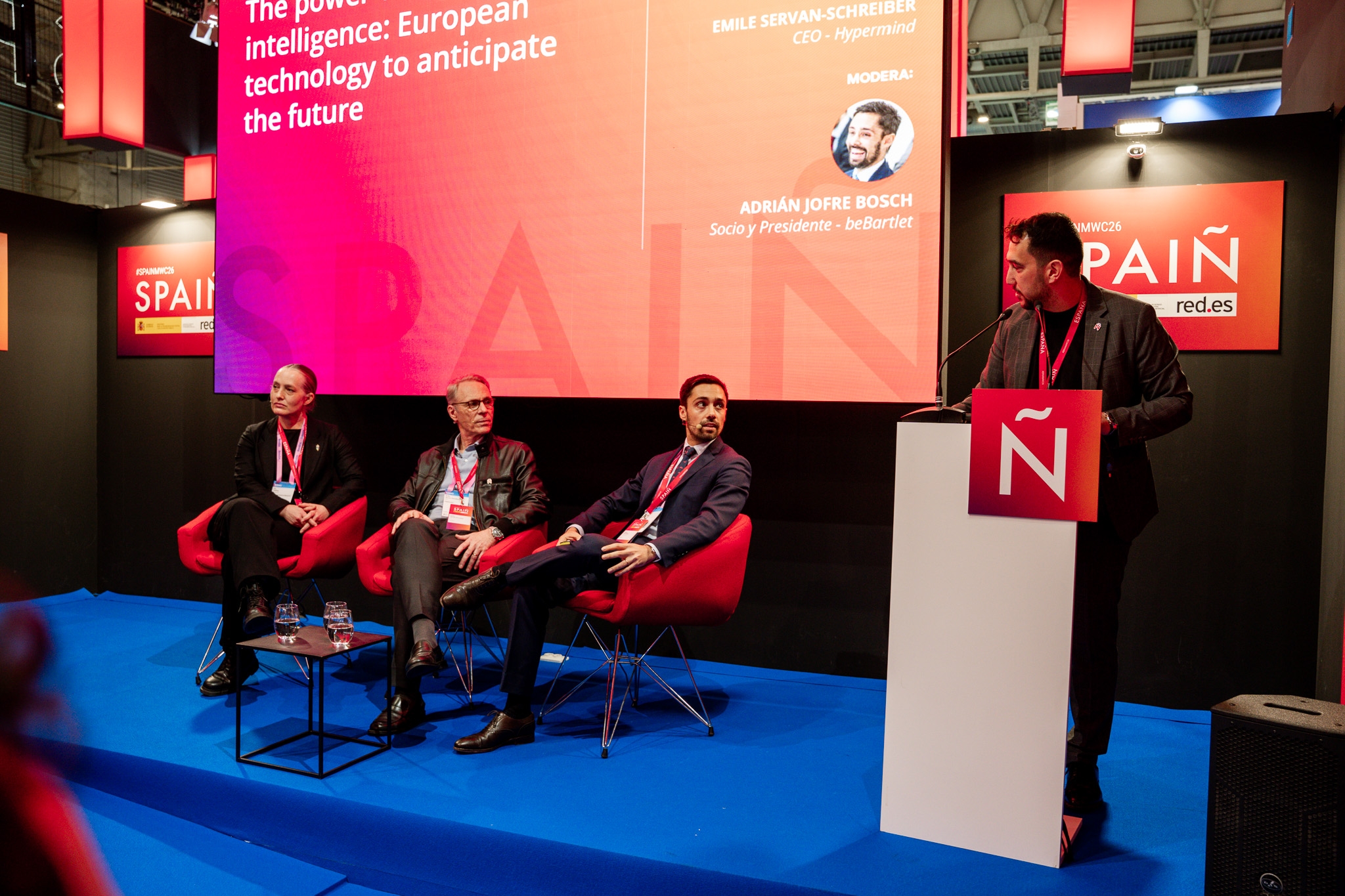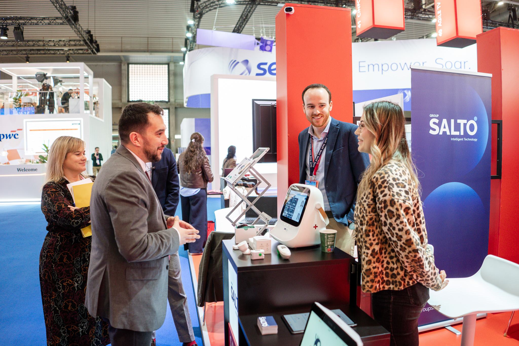Empresarios/as, ejecutivos/as, expertos/as, autoridades y visitantes reunidos/as en el Pabellón de España durante MWC.