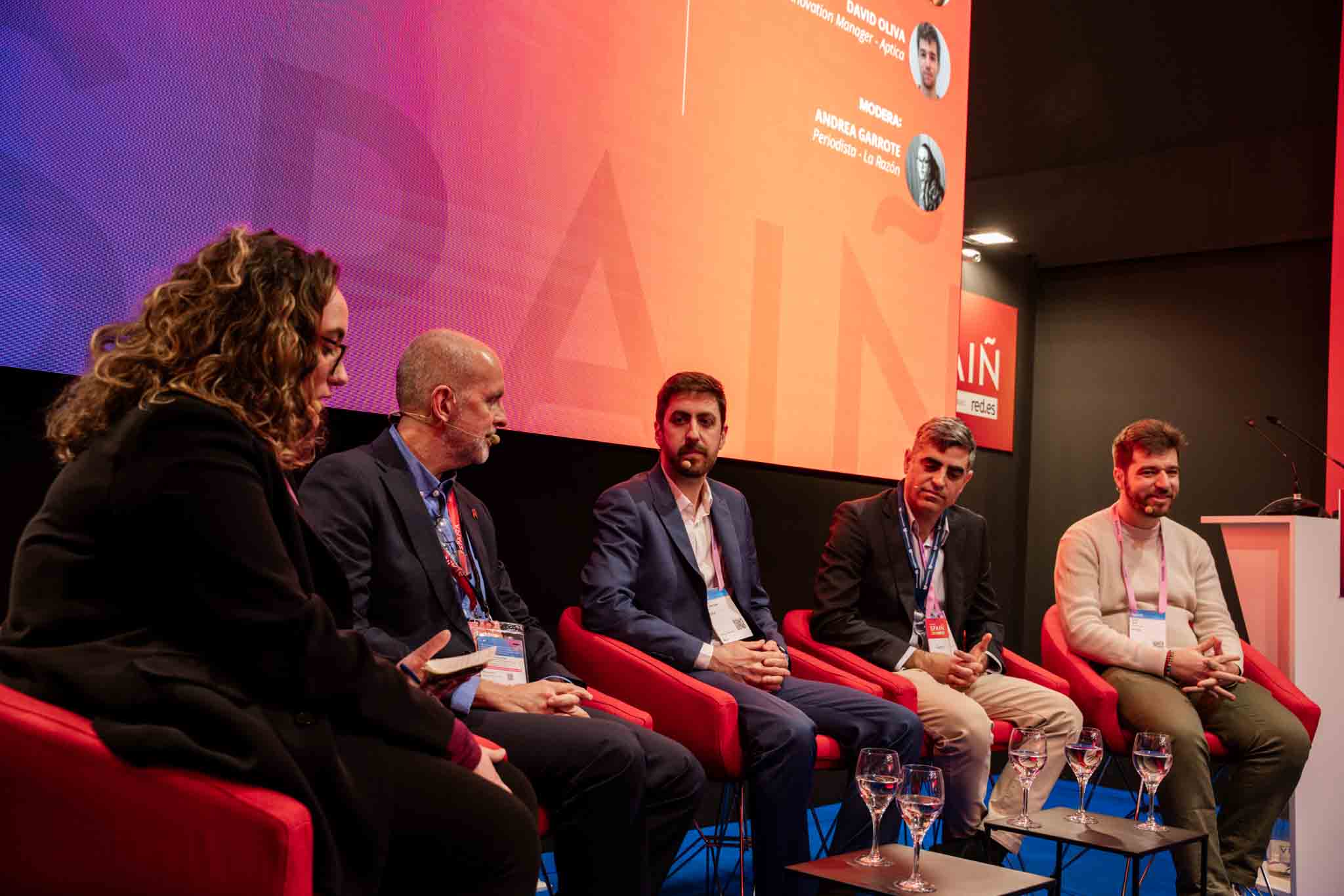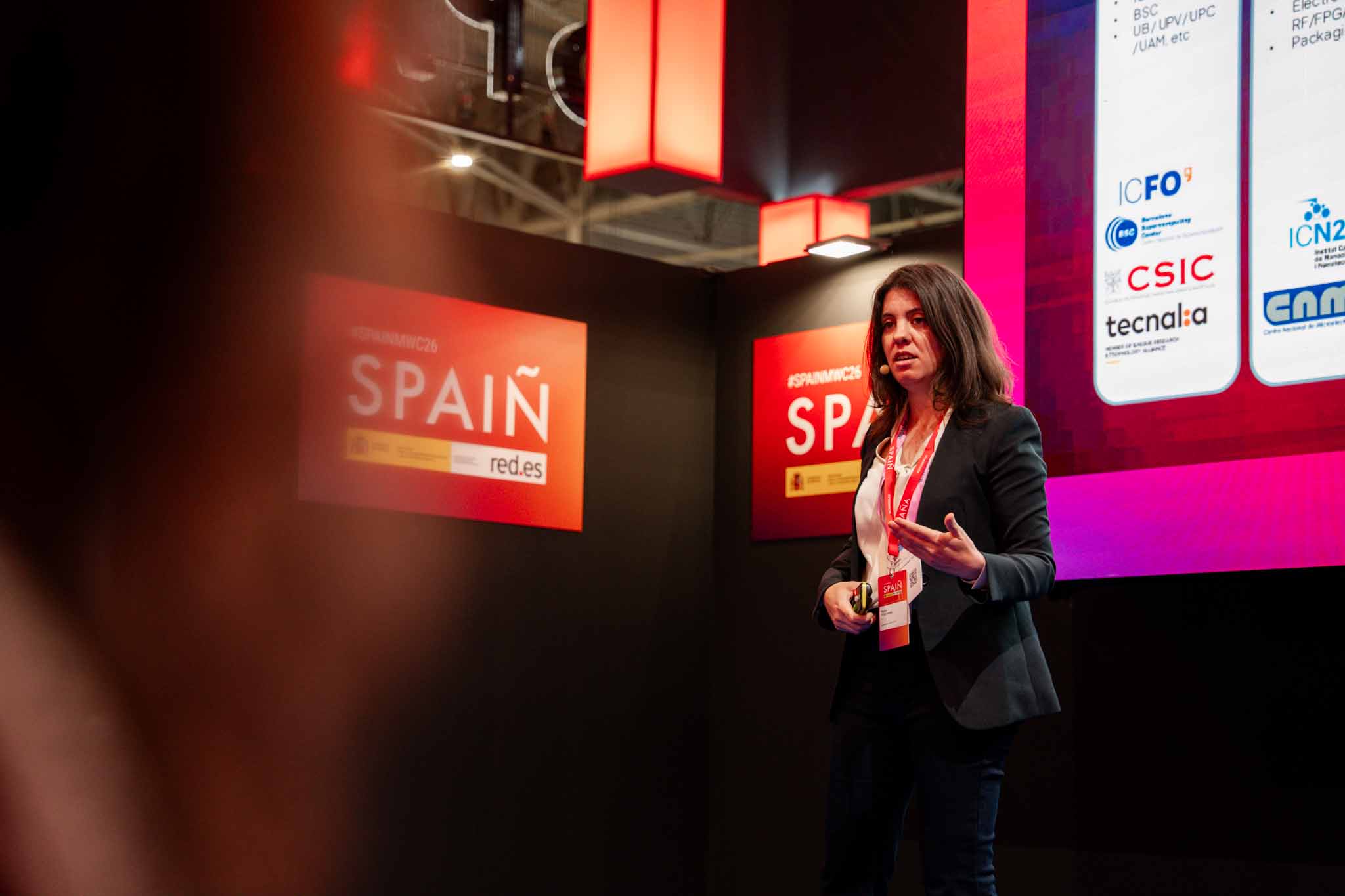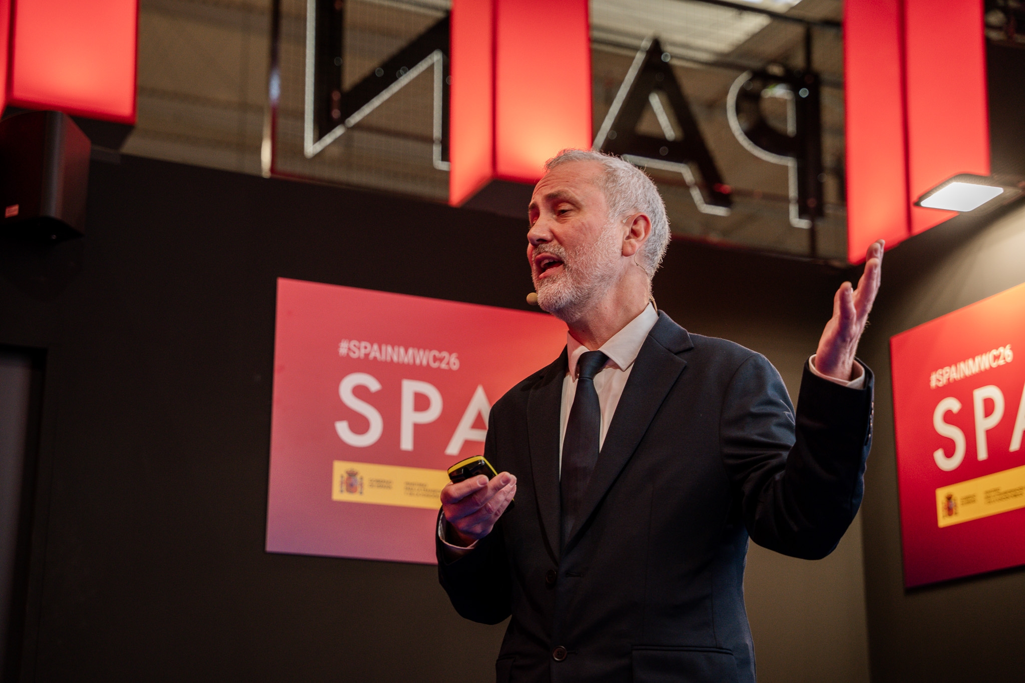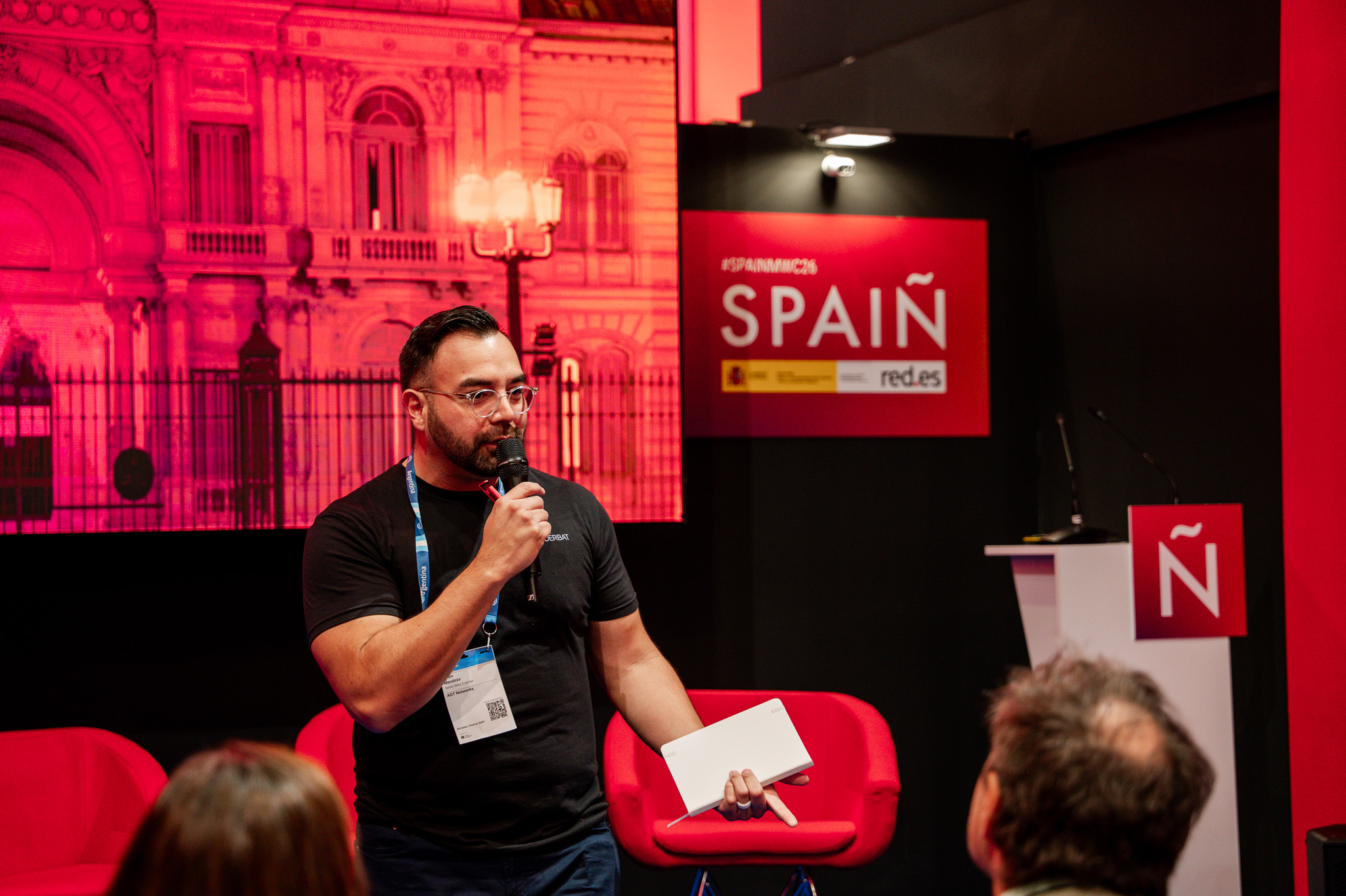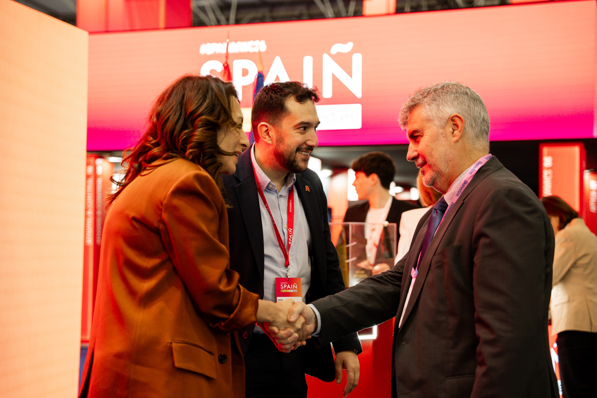 Empresarios/as, ejecutivos/as, expertos/as, autoridades y visitantes reunidos/as en el Pabellón de España durante MWC.