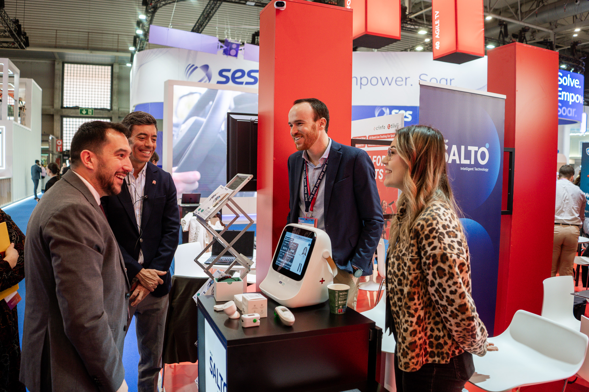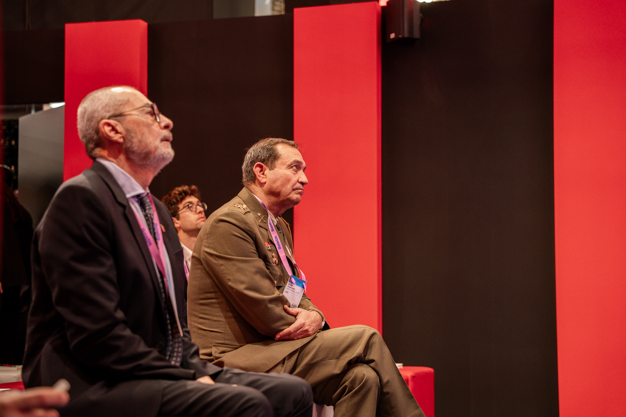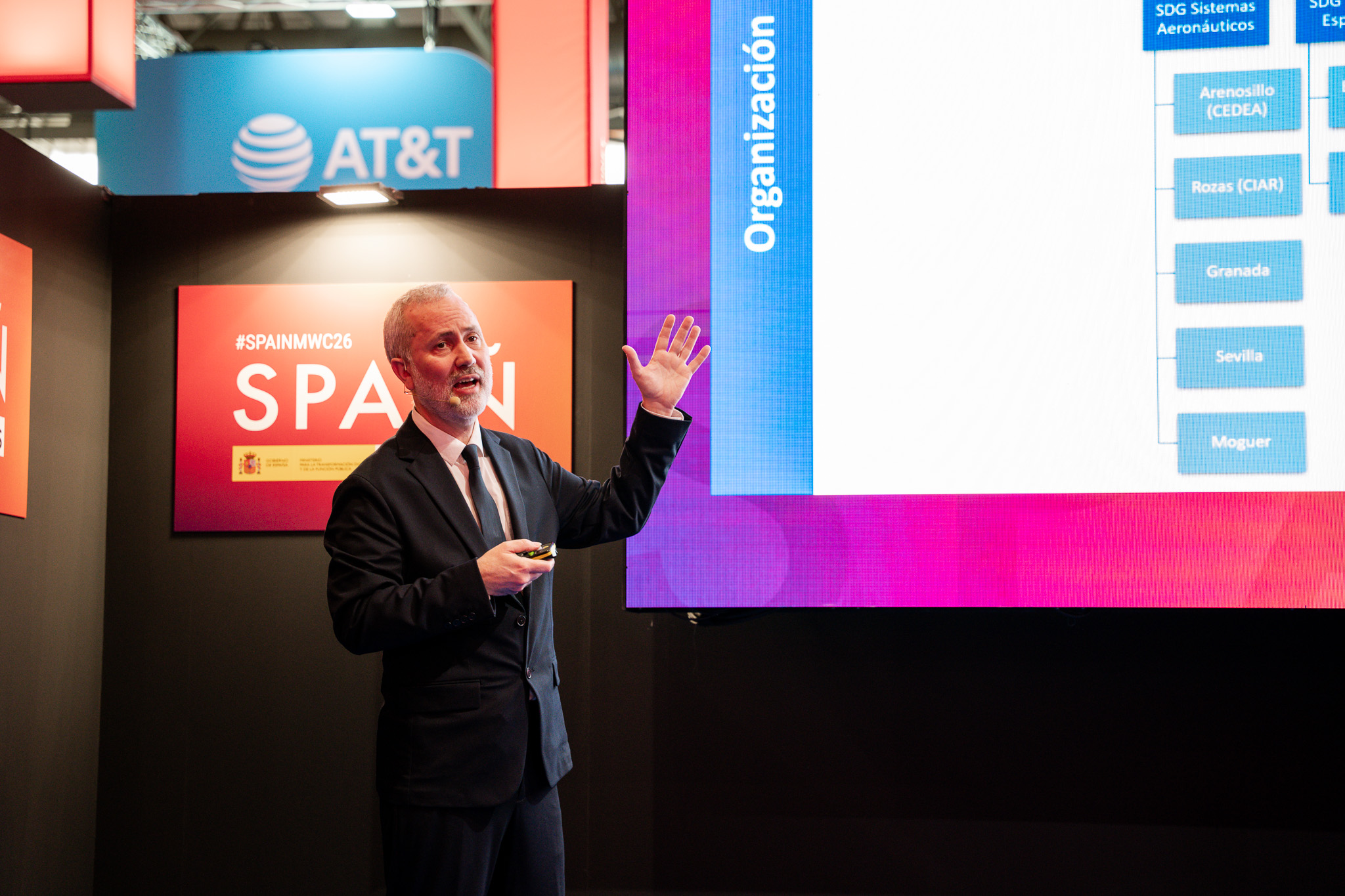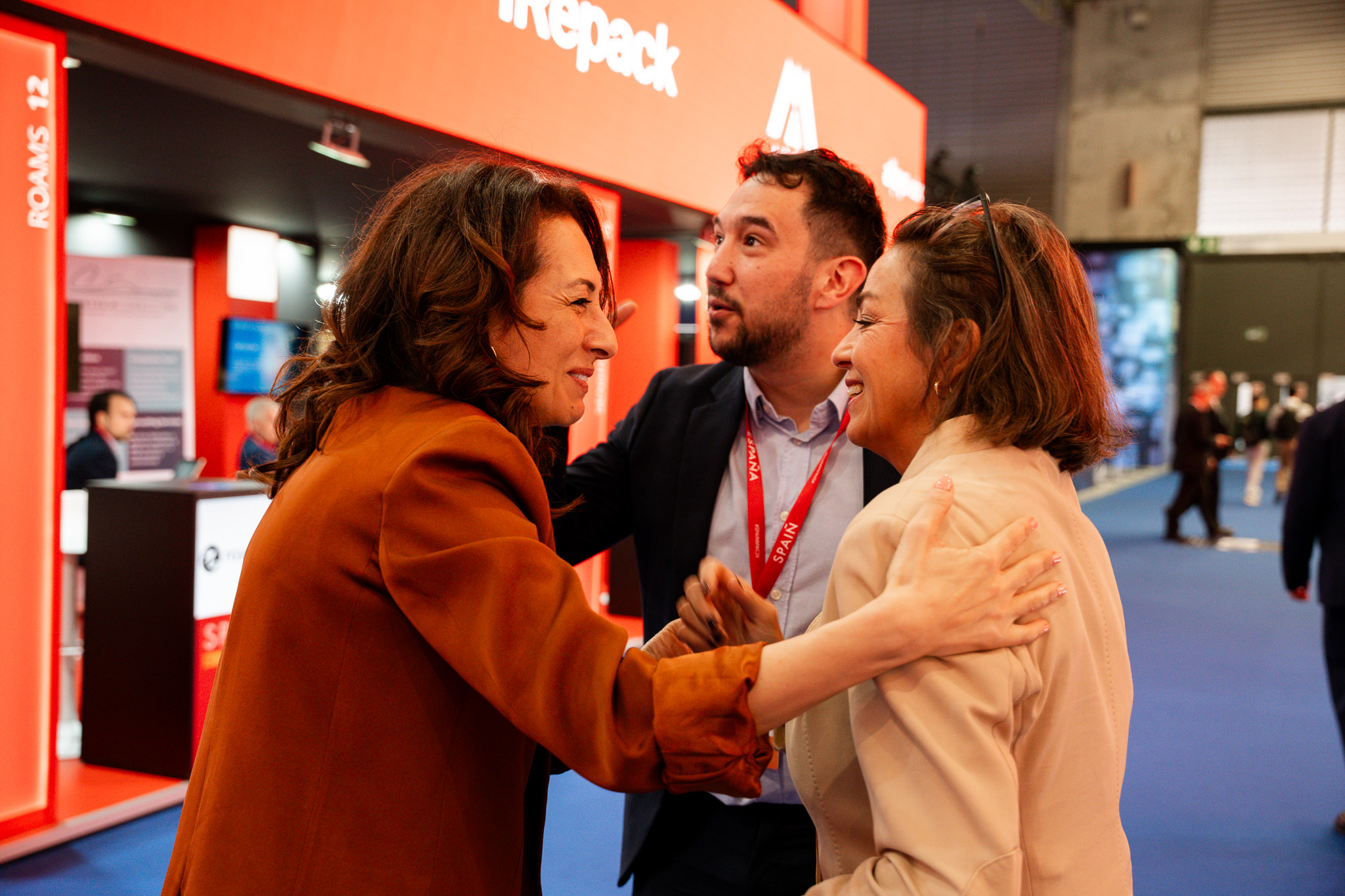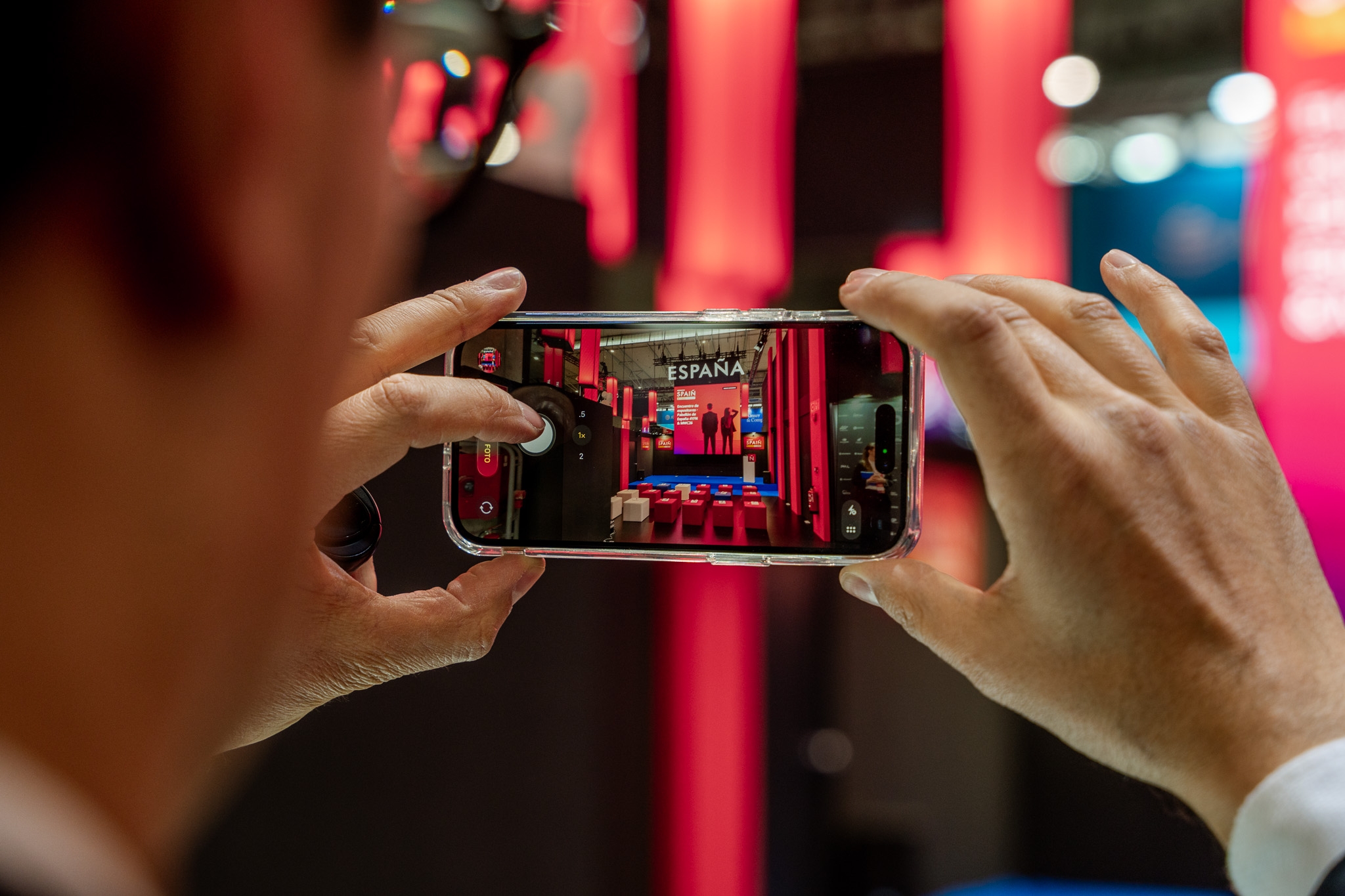 Empresarios/as, ejecutivos/as, expertos/as, autoridades y visitantes reunidos/as en el Pabellón de España durante MWC.