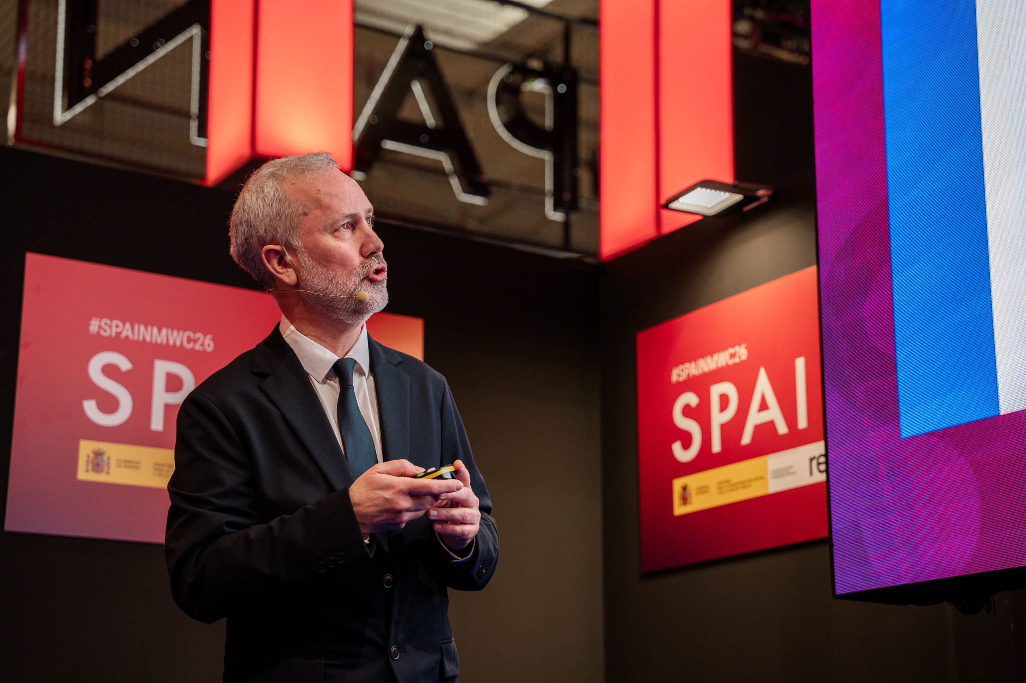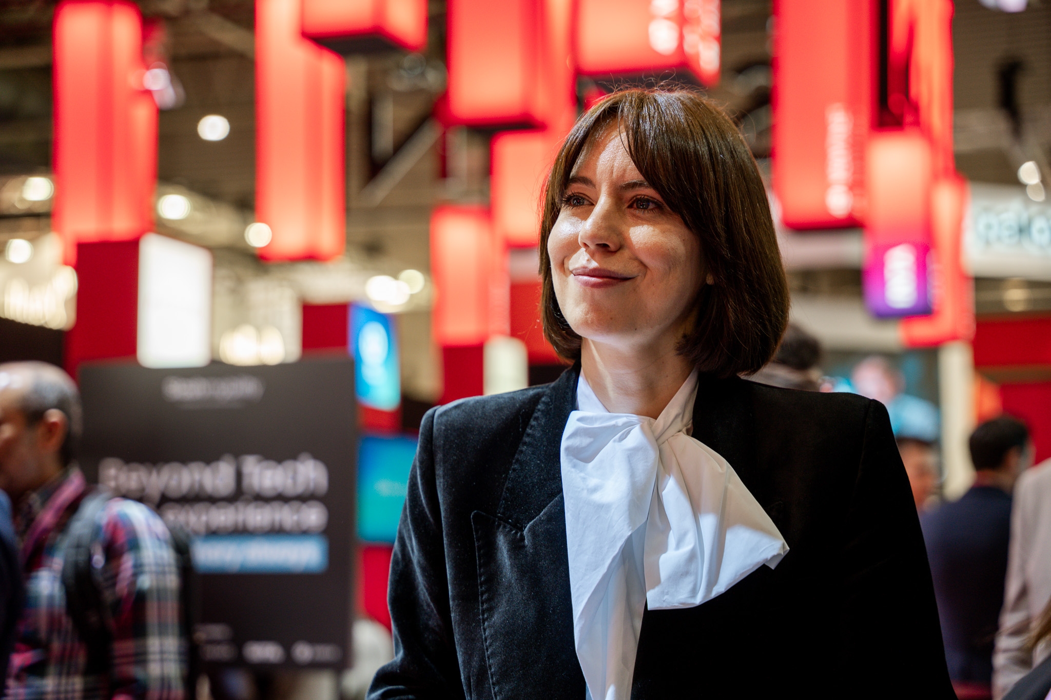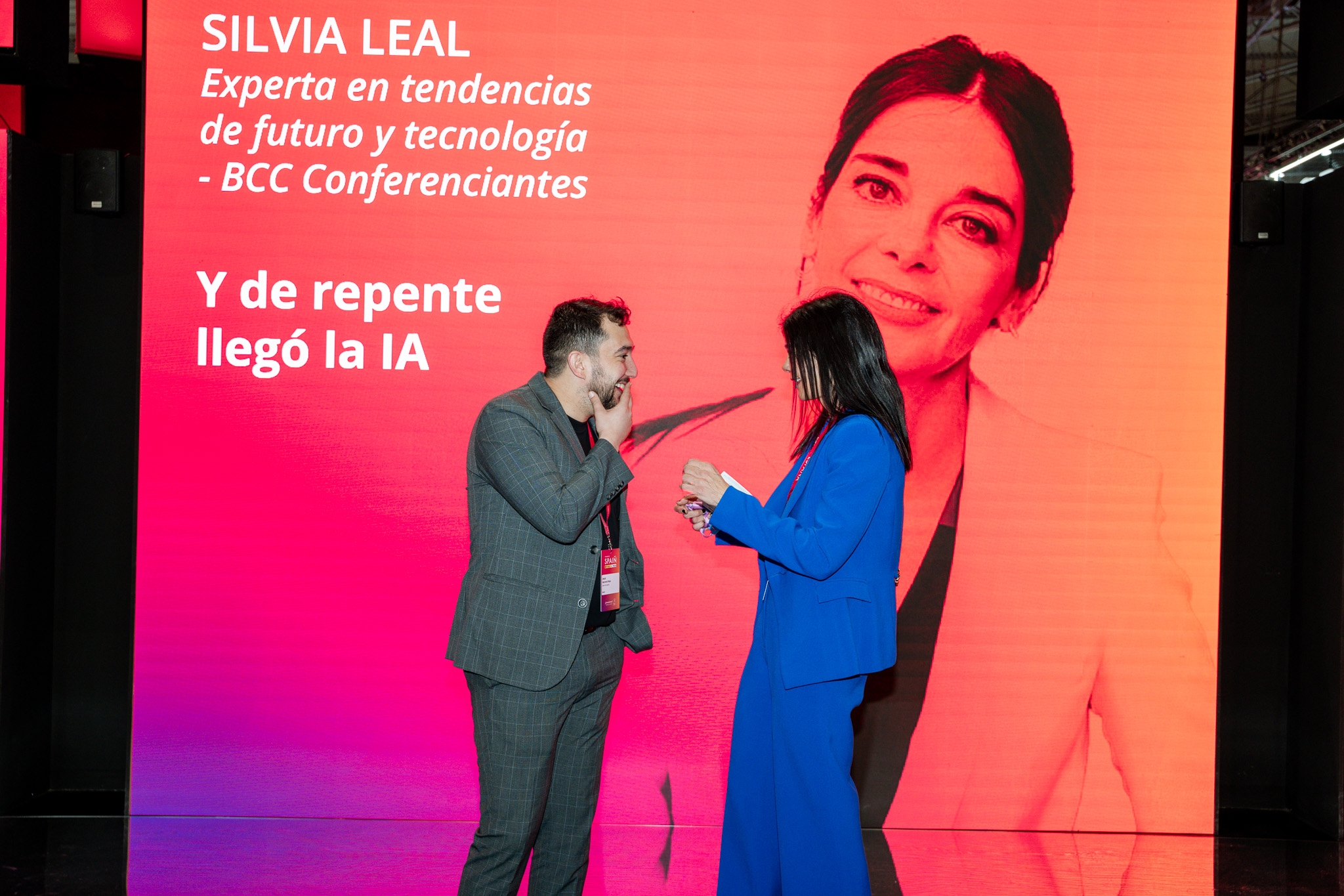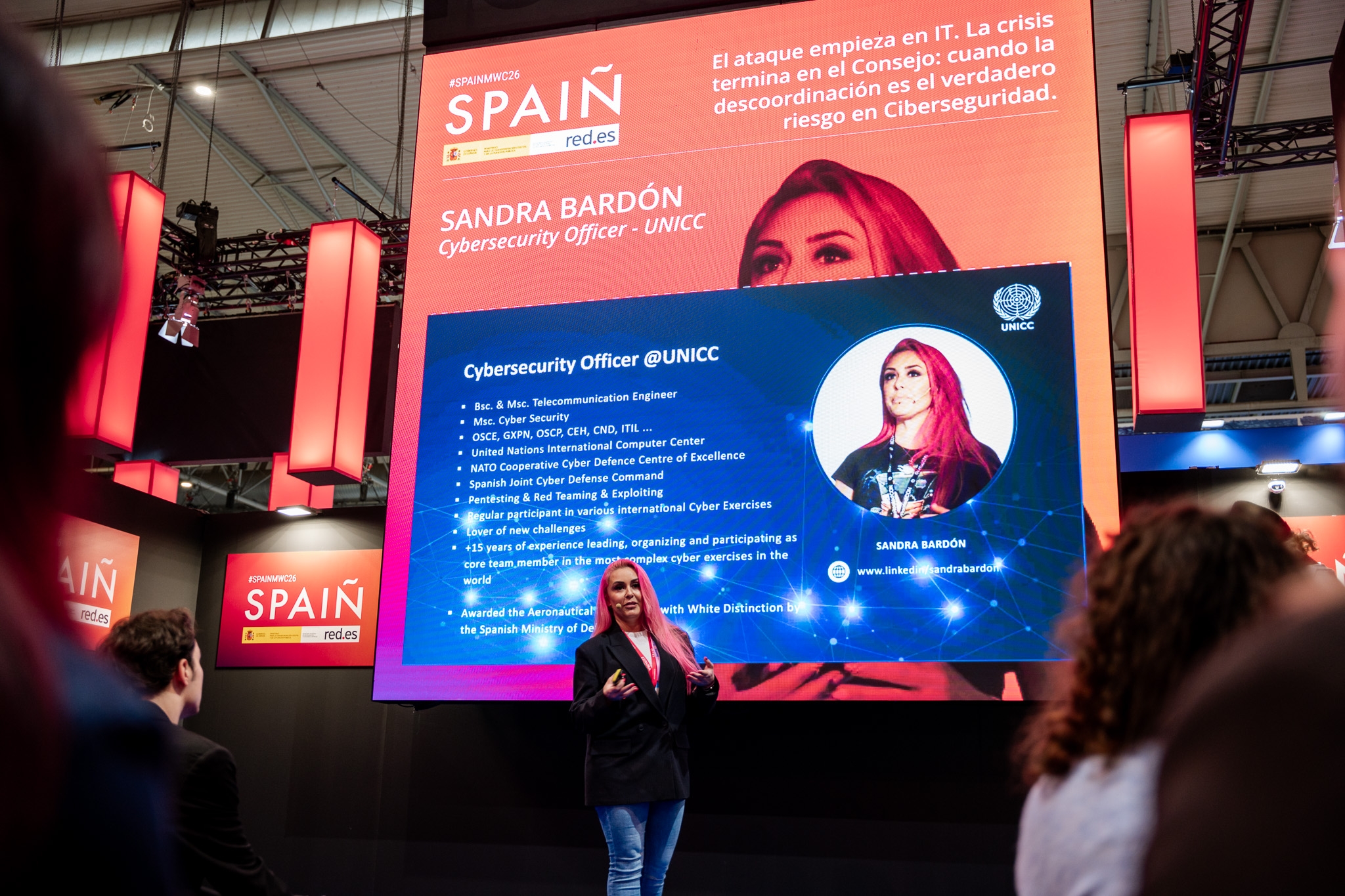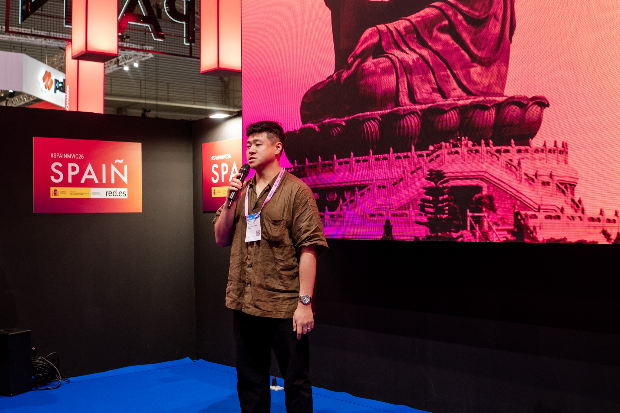 Empresarios/as, ejecutivos/as, expertos/as, autoridades y visitantes reunidos/as en el Pabellón de España durante MWC.